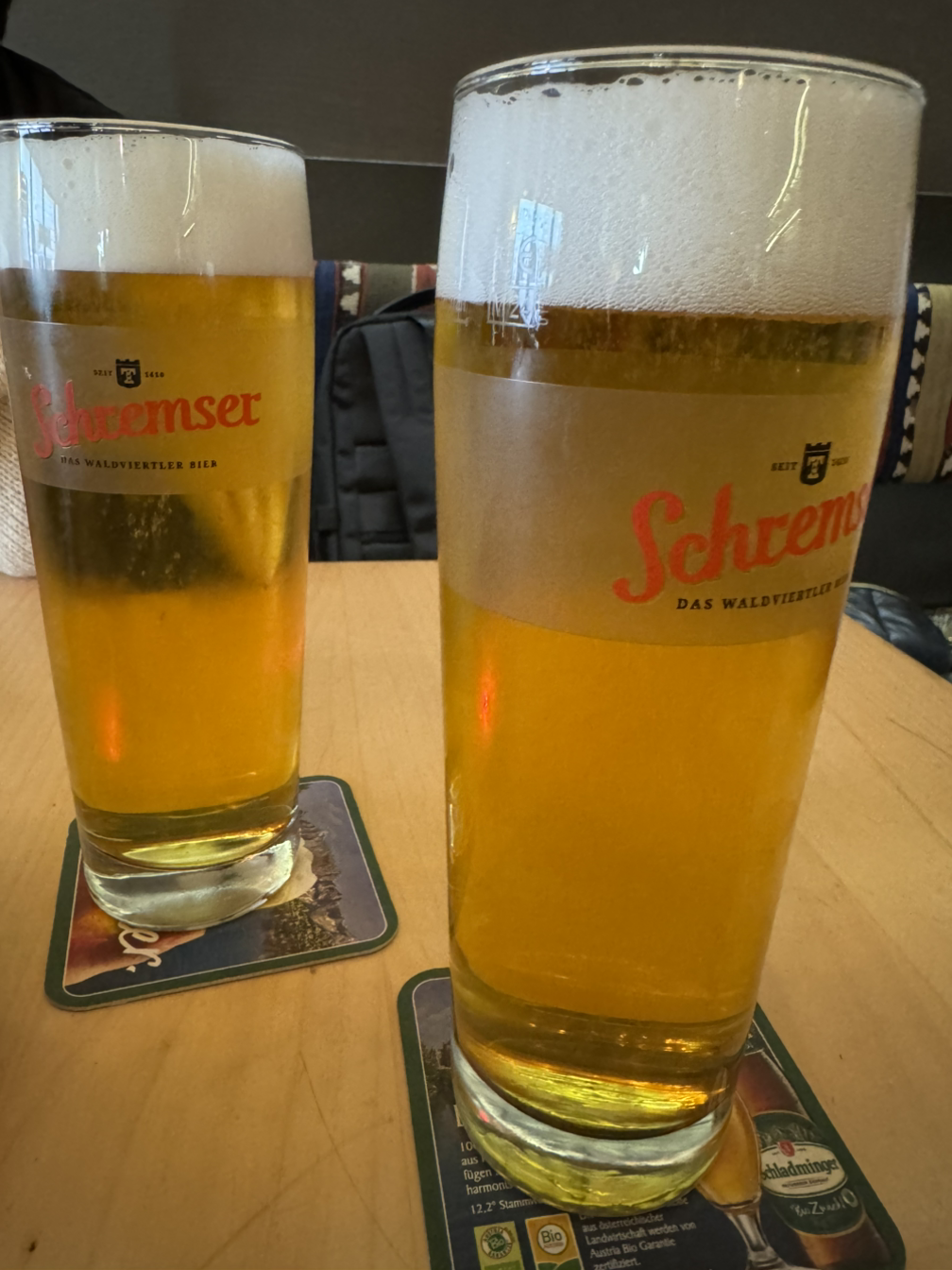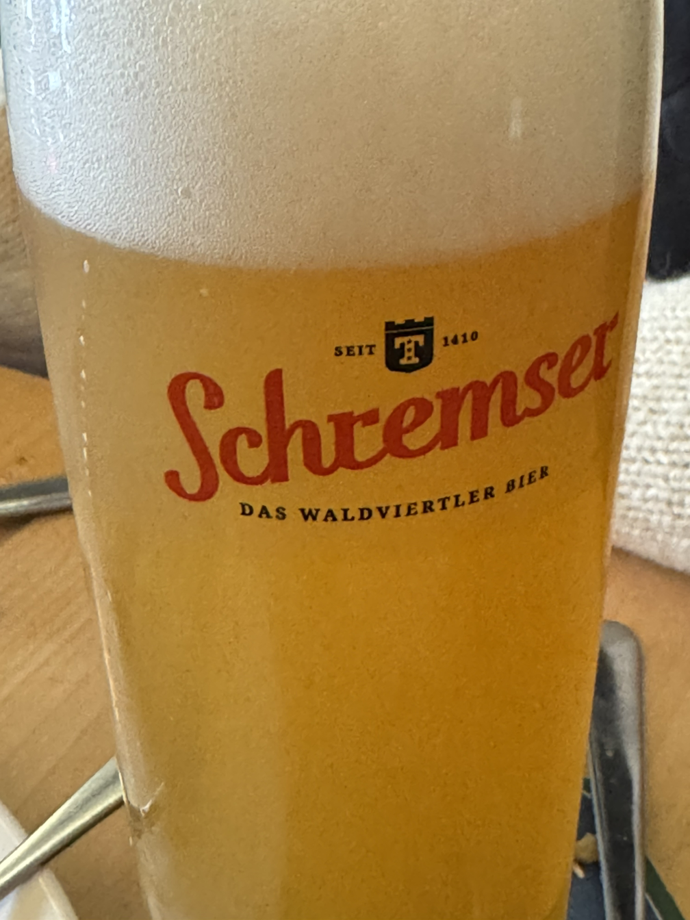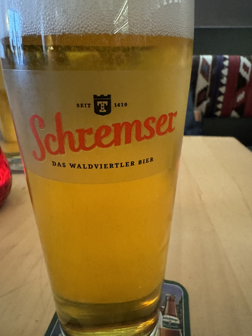 Schremser 맥주는 오스트리아 북부의 발트피어텔(Waldviertel) 지역에 위치한 슈렘스(Schrems) 마을은 체코와의 국경과 인접해 있다. Schremser 양조장은 1410년경부터 맥주를 양조해 온 것으로 문헌에 기록되어 있어, 오스트리아에서 가장 오래된 양조장 중 하나로 알려져 있다. 지역의 청정한 자연환경과 전통적인 양조 방식을 결합하여 독특한 풍미를 자랑하는데, 특히, 유기농 재료를 사용한 다양한 종류의 맥주를 생산한다고 한다. , 메뉴판의 ‘Schremser Bio‘ 궁금하다는 핑계로 라거를 얼른 한 잔 비우고 주문했다. 유기농 보리와 홉을 사용하여 양조되며, 필터링 과정을 거치지 않아 자연 그대로의 풍미를 제공한다고…. 탄산감에 실려오는 독특한 맛은 어느 장르에도 속하지 않는 새로운 맛이다. 옅은 에일과 옅은 밀맥주 사이 경계 어딘가에 있을 거 같은데, 맛이 묘하다.