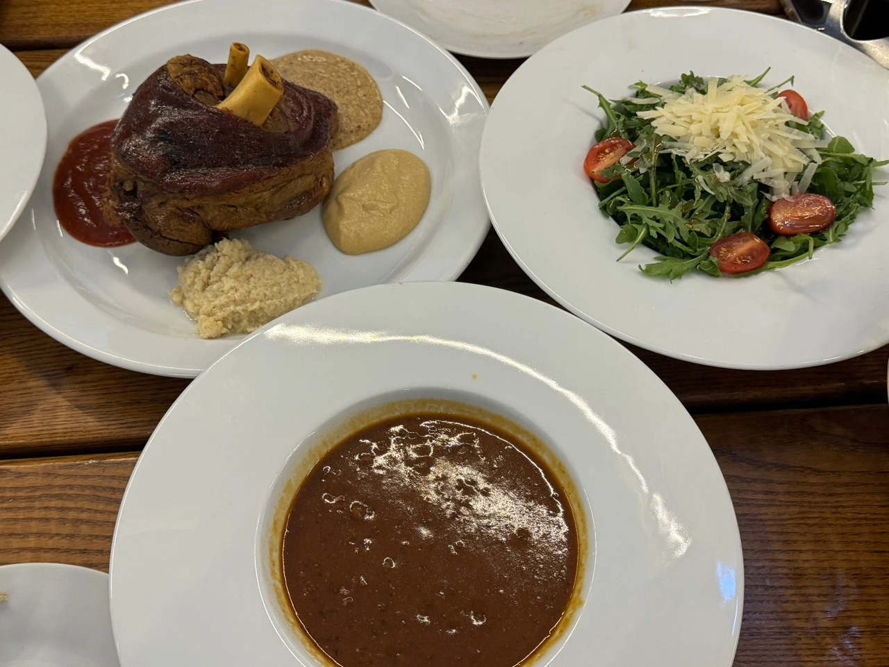 2011년 프라하에 처음 왔을 때 먹었던 굴라쉬는 거의 육개장에 가까웠었는데, 오늘 이 굴라쉬는 진하고 건더기가 많지 않아서 국이라기보다는 진한 수프에 가깝다. 맛도 역시 진하다. 짠 득한 식전빵과 잘 어울린다. 루꼴라에 토마토가 버무려진 시저 샐러드는 청상추가 아니어서 특히 했다. 루꼴라의 향이 진하고 깊어서 맥주와 잘 어울린다. 학센은 처음 부드러울 때 계속 먹어야 하는데, 시간이 지나면서 약간 딱딱해져서 애초에 기대에는 약간 못 미쳤다. 맥주가 맛있으니 모든 것이 다 이해되고 수용할 수 있다. 모자란듯하게 일어서는 게 좋은데 학센이 차지한 자리가 약간 허전해서 연어 샐러드를 추가로 주문했다.