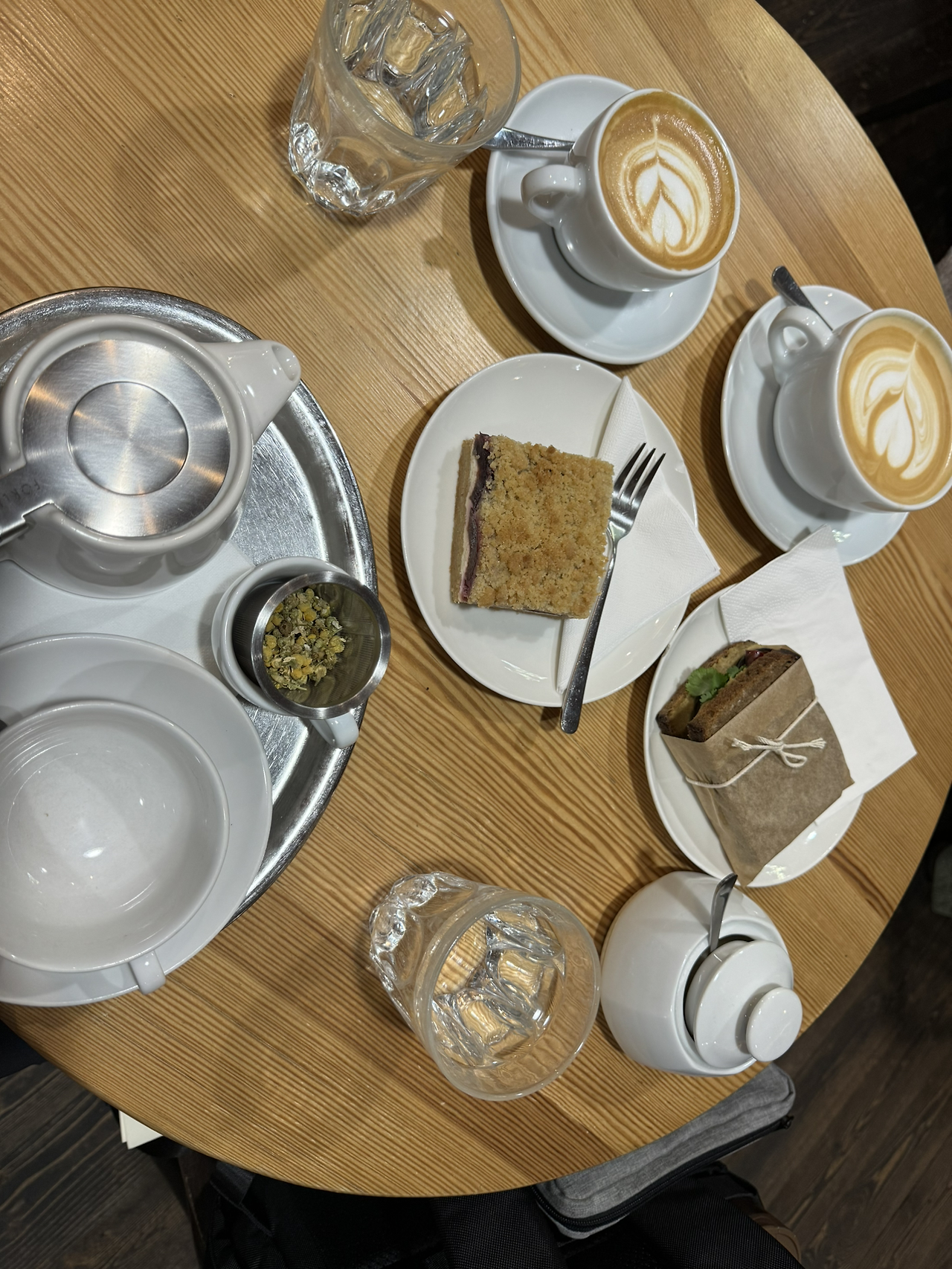 한 자리 남은 테이블에 앉았다. 평일 오후 늦은 시간인데도 사람들이 꽉 차 있었다. 카모마일 티백만 먹다가 원물을 우려내는 경험을 하게 되었다. 은은한 향이 몸안 가득 퍼진다. 시그니처 메뉴는 시나몬 케이크인데 판매완료되었다니 아쉽다. 대신 럼블 케이크를 시켰다. 모양이 예뻐서 주문한 비건 샌드위치는 적응하기 쉽지 않은 맛이라 서로 미루다가 반쯤 남겼다.