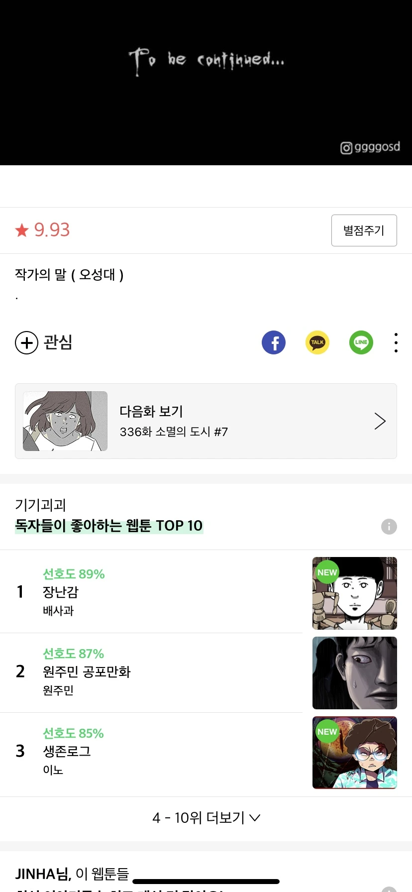 네이버 웹툰에서는 작품 감상이 끝난 후 추가적인 콘텐츠의 존재를 어필하고 있습니다. 작품 감상과 함께 사용자의 흐름(User flow)이 함께 끝나는 허무함을 방지할 수 있을 거예요.