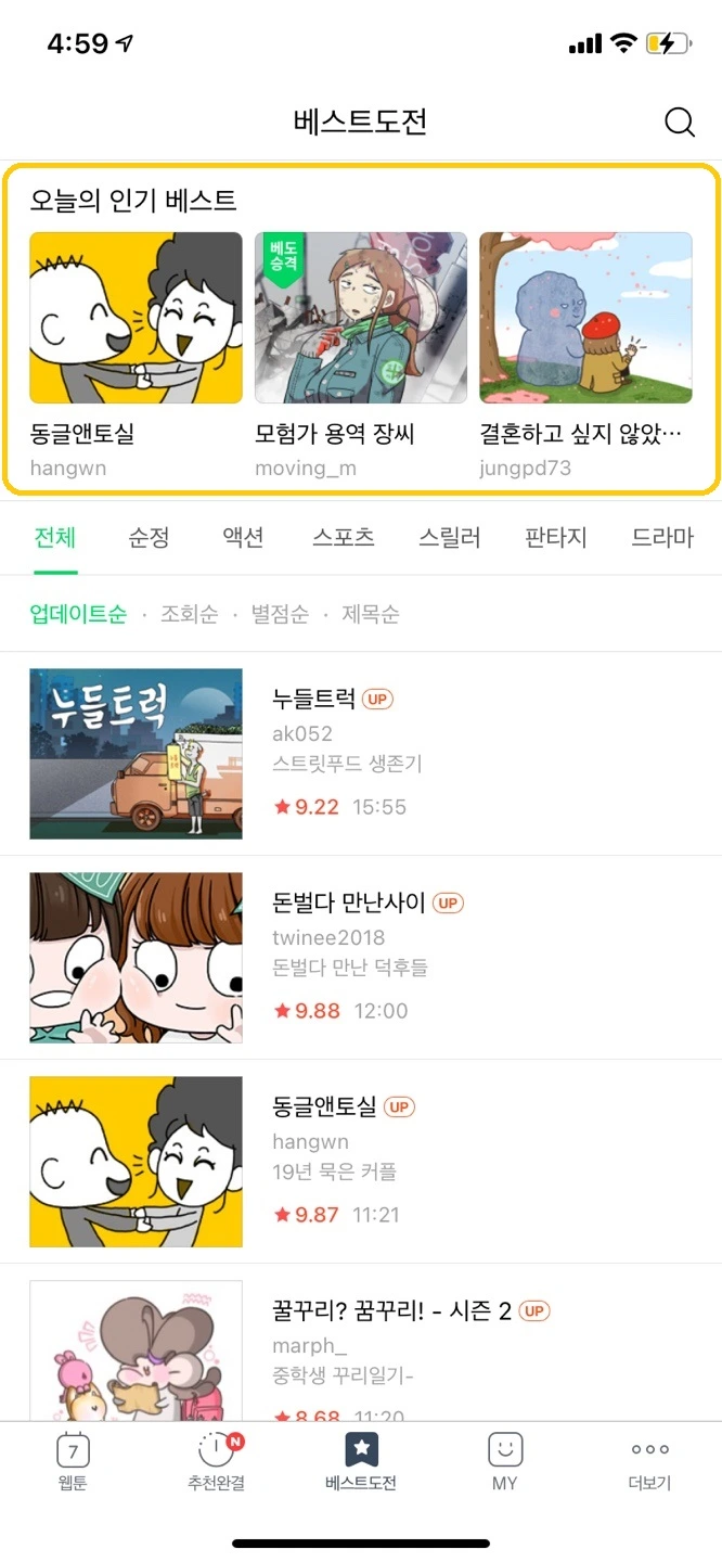 선택지가 많으면 이른바 '결정장애'를 유발하게 될 거예요. 네이버 웹툰은 정말 많은 작품을 보유하고 있는 데다가 아마추어 작가들까지 '베스트 도전'을 통해 지속적으로 작품을 업로드하고 있으니 어떤 콘텐츠를 볼지 탐색하기 시작하면 끝도 없는 결정 장애의 늪에 빠질 수 있을 것 같아요. 네이버 웹툰을 달고 사는 저도 또 다른 작품을 탐색하다 보면 지치곤 했었거든요. 이런 문제를 완화하기 위해 메인에서는 신작 탭을 강조해 고민을 줄여주거나, 추천 완결에선 사용자화를 통한 추천 시스템을 도입했고, 베스트도 전 탭에서는 제일 상단에 오늘의 인기 베스트 작품을 선정해 두었어요. 이런 장치들이 사용자가 의사결정 자체에 지쳐버리는 경험을 줄여줄 겁니다.