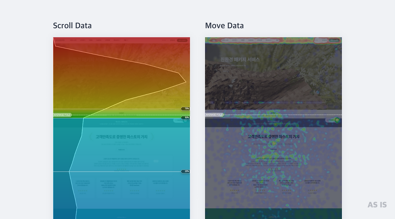 무브 데이터로 마우스 움직임도 확인해봤다. 메인 페이지 전체를 기준으로 봤을 때 후기 영역에 마우스 움직임이 활발했다. 이 두 가지 데이터로 전체 사용자 대비 후기까지 도달하는 비율은 적지만, 후기 내용 자체에는 관심이 있다는 것을 확인할 수 있었다. GNB 두 번째 메뉴에 '고객 후기'가 있기 때문에, 메인 페이지에서 후기를 세세하게 보여주기보다 텍스트 양을 줄이고 이미지를 활용하여 눈에 잘 들어오게 변경하기로 했다.