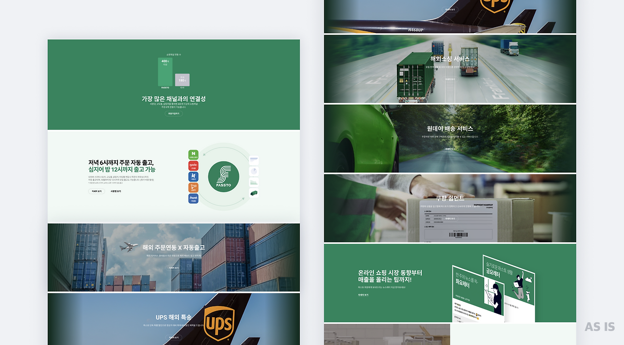 최상단 배너에 있는 슬로건으로 풀필먼트 서비스라는 건 바로 파악할 수 있었다. 다만, 풀필먼트 범위 안에서도 어떤 서비스를 제공하는지가 한눈에 잘 들어오지 않았다. 페이지 중앙에 백그라운드 이미지와 함께 해외 배송, 원데이 배송 등 주요 서비스가 나열되어 있지만 똑같은 레이아웃이 길게 반복되다 보니 집중도가 떨어지는 점이 아쉬웠다.