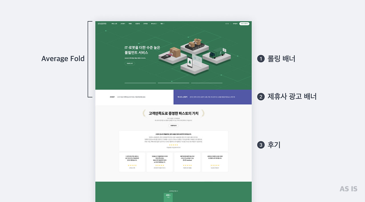 페이지 전체에서 제일 아쉬웠던 부분은 상단 영역이었다. Average Fold(스크롤을 하지 않아도 기본적으로 보이는 영역) 바로 아래는 제휴 업체 광고 배너와 앞서 언급한 후기로 구성되어 있는데, 스크롤을 내리자마자 텍스트의 양이 너무 많아 읽기 전에 이미 피로감을 느꼈다(..)
