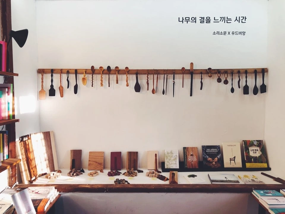 첫 번째 기획은 제주에서 우드 카빙 작품을 만들고 있는 ‘우드비앙’과 함께 협업을 하였다. 종이로 만들어진 책도 사실 나무에서 나온 것지만 책을 읽으며 나무를 떠올리지는 않는다. 책처럼 우리가 일상생활에서 흔히 보는 다양한 물건에 나무가 포함되어 있다. 그러나 대부분 그 나무의 가치를 깊이 생각하지 않고 단순히 사용하는 소비재로만 인식해왔다. 그래서 우리 주변에 흔히 볼 수 있는 물건들의 바탕이 되는 나무의 결과 향을 느껴보고 그 가치를 생각해보고자 우드비앙과 기획전을 준비했다. 단순히 우드 카빙 제품을 홍보하는 공간을 넘어서, 우리가 자주 사용하는 물건이 어떤 나무에서 만들어졌는지 그 깊이를 느껴보고 소중함을 다시 인식해보기를 권하고 싶었다. 책도 마찬가지였다. 나무에서 나온 종이로 만들어졌지만 한 권의 책 안에 담긴 가치는 어마어마하다. 그러나 한 권의 책에 담긴 나무의 숨결과, 그것을 만들어 낸 사람들의 노력은 보지 않고 쉽게 버려지는 소비재로 전락하기도 한다. 가까이에 있는 물건들을 조금 다르게 보고 그 바탕이 되는 나무의 힘을 느껴보면 책과 사물들의 소중함도 더 커질 것이고 그것을 만드는 것이 얼마나 소중한 일인지 깨닫게 될 것이다. 이 메시지를 전하고싶어 우드비앙과의 협업이 처음 시작되었다.