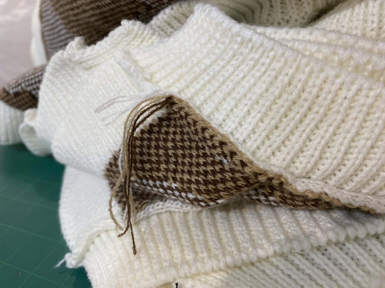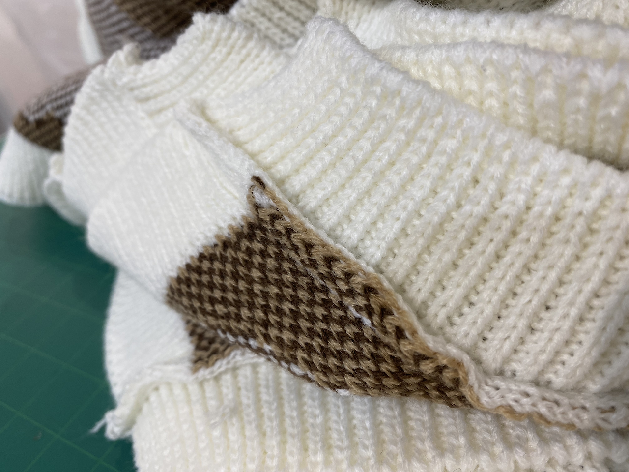 시야게는 대략, 니트 사시 봉제 후 생겨나는 실들을 보기에 깔끔하고 이쁘게 봉해서 넣어주고 잘라주는 마무리 작업이다 :)
