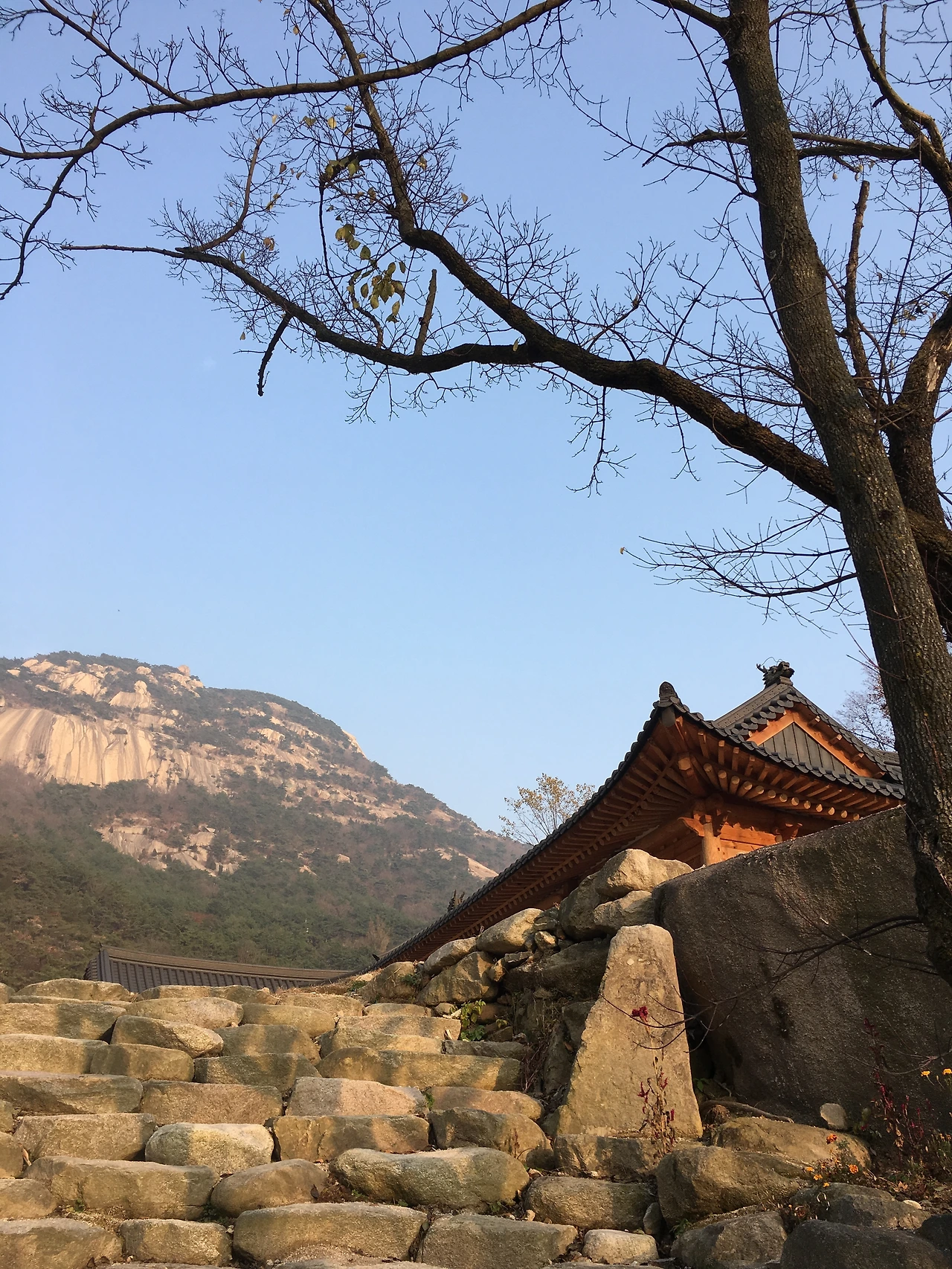 돌계단 너머로 보이는 처마와 모나지 않은 넉넉한 풍경의 원효봉에 감탄하여 한참을 쳐다보고 있었다.