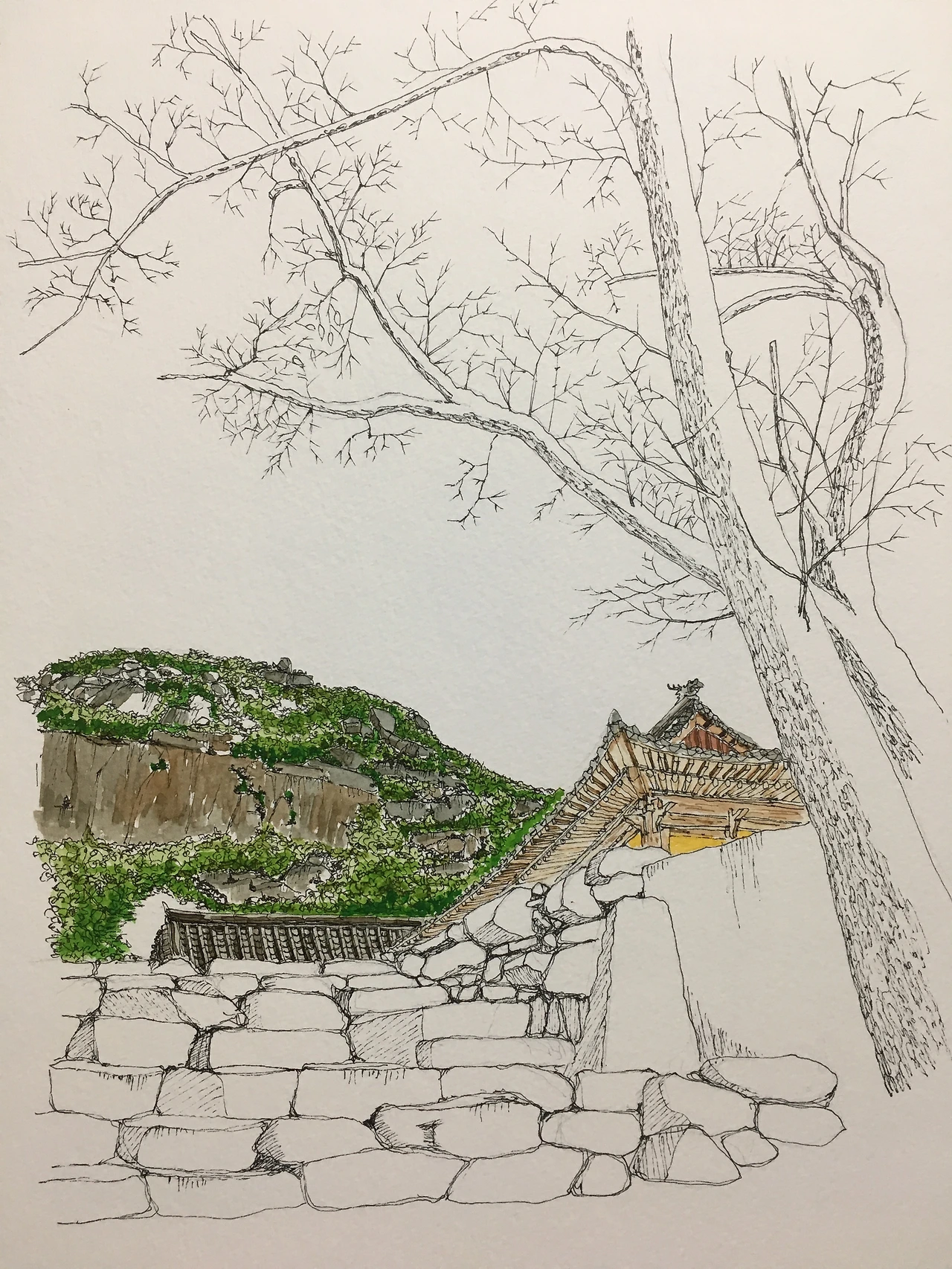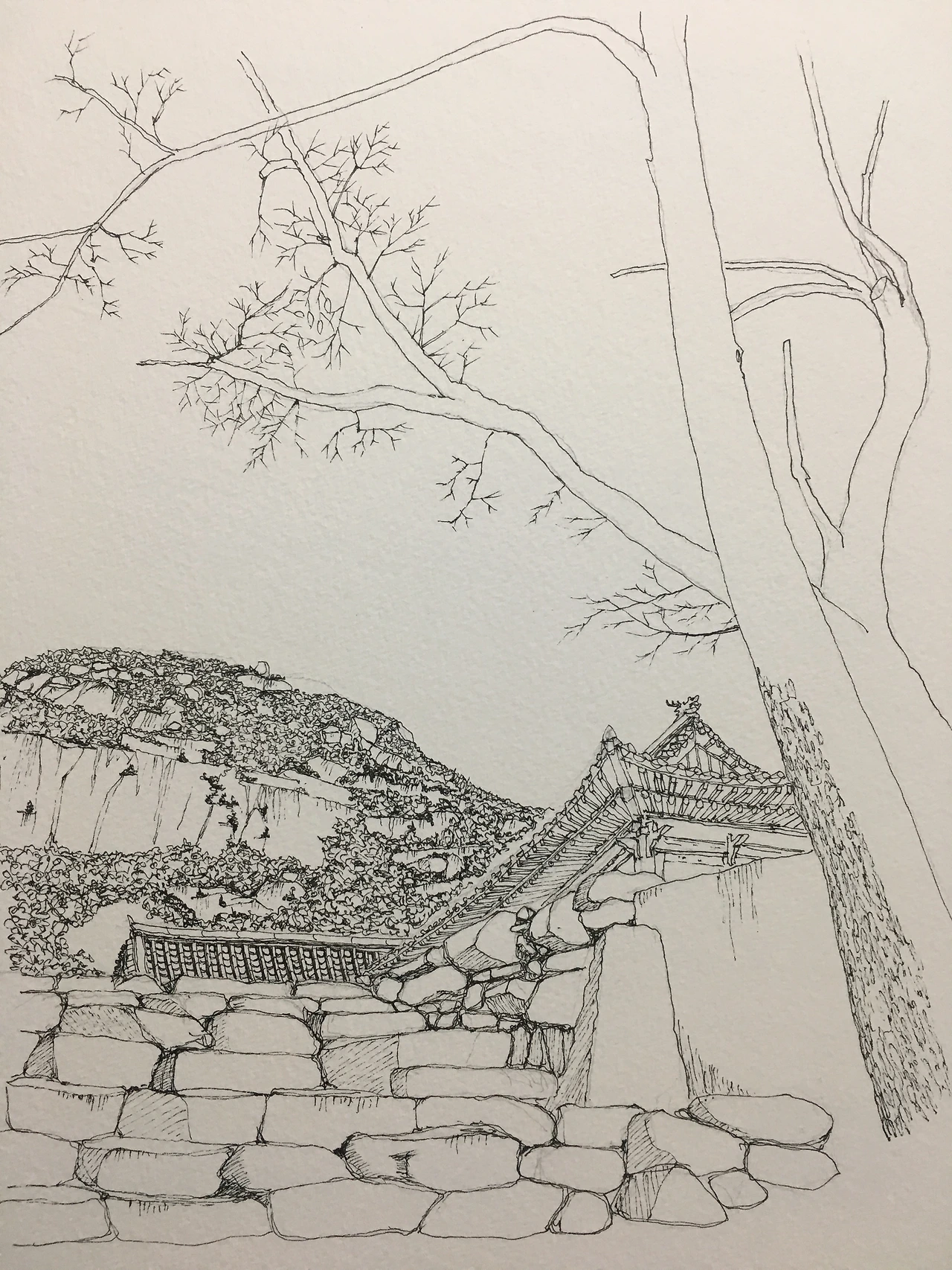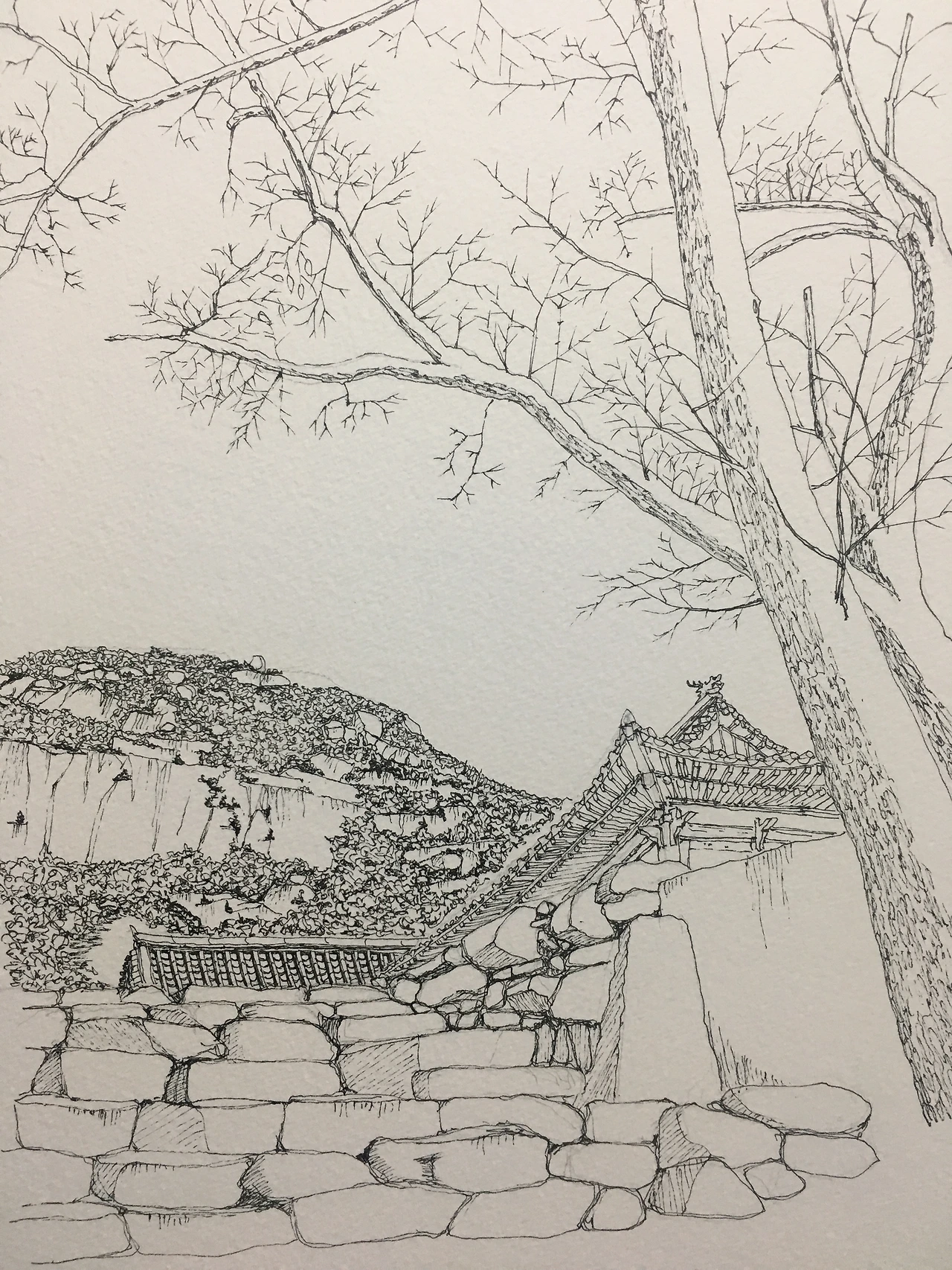 서암사와 뒤에 보이는 산은 원효봉(이라 쓰고 우긴다)이다. 별생각 없이 나무를 그리다가 ‘나뭇가지 지옥’에 빠졌다. 그리고 또 그렸다.(으으. 이제 그만)