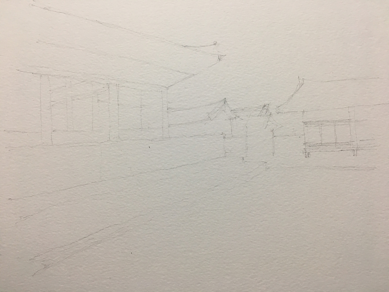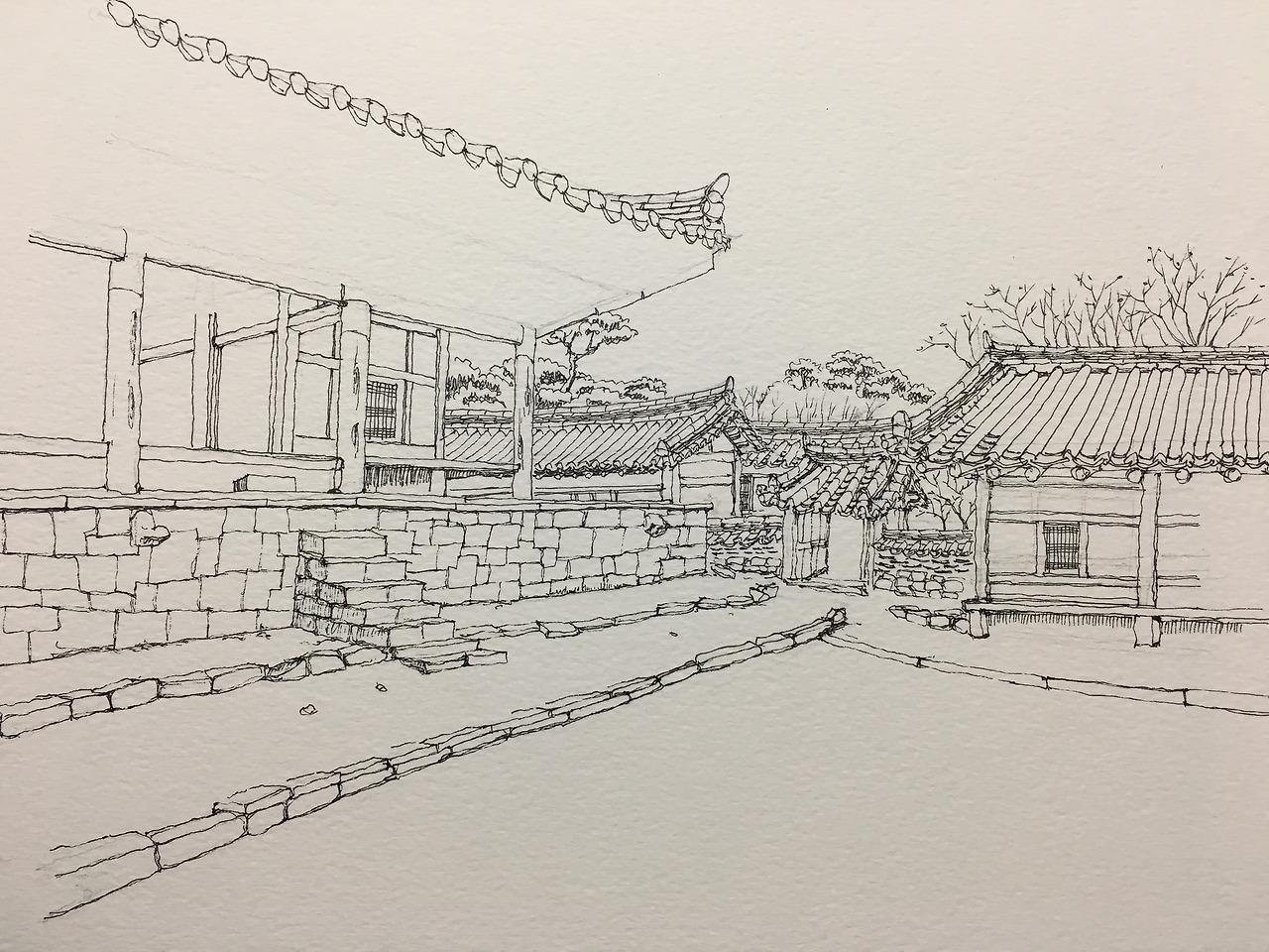 이 석축을 잘 그려야 할 텐데. 조심스레 스케치를 하고 먹물을 입힌다.