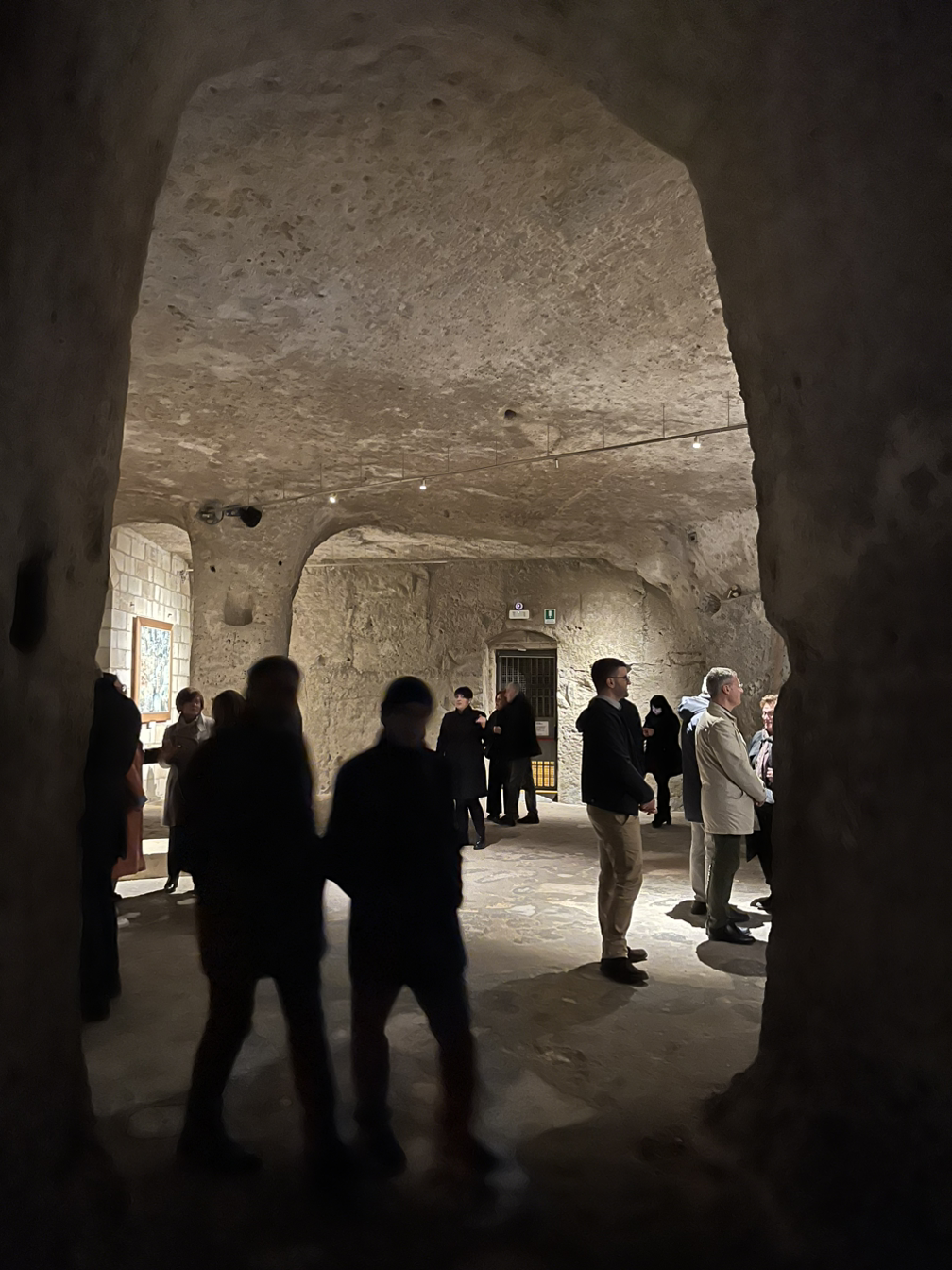 젤라또를 먹고 나서도 충전이 되지 않는다. 호텔로 돌아와서 한 시간 정도 낮잠을 자고 다시 역사지구로 나가보았다. 3월이라 그런지 아직 날씨가 쌀쌀하다. 당연히 모기도 없고 눈도 없다(갑자기 스노타이어 대여비가 생각났다). 조명을 밝힌 마테라는 마치 짙은 화장을 하고 밤무대에 나선 배우같이 낮과 밤이 너무 다르다. 불빛에 홀려(바를레타에서도 그렇고 여기서도 그렇고) 이리저리 돌아다니다가 웅성웅성 사람들이 모여서 내는 소리가 암벽뒤에서 들려온다. 소리를 따라가보니 동굴예배당이었던 곳에서 세라믹타일 전시를 하고 있었다. 암벽에 동굴을 만들고 내부를 다듬어 기둥과 아치를 만들고 프레스코화로 성화를 만들어두었던 곳이다. 마테라가 ‘이탈리아의 수치’로 기억되는 기간 동안 이곳은 쓰레기로 가득했던 공간이었다고 했다. 지금은 이렇게 전시회를 여는 공간으로 사용되고 있다. 전시되었던 세라믹타일도 근사했지만 공간 자체가 주는 경이로움이 더 컸던 곳이다.