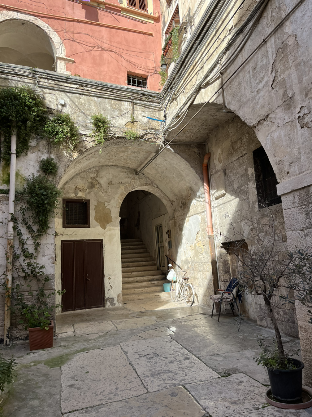 이 두 친구들은 Michele and Giulio, 미켈레와 굴리오(맞게 읽은 것일까)이고, 둘이서 공동운영하는 듯한 숙소의 이름은 두오모 게스트 하우스(Duomo Guest House)이다. 겉에서 보기에는 번지수도 붙어 있지 않은 곳이지만 그래도 역사가 있는 건물이라고 한다. 예전에 산타크로체 궁(宮)이라고 불릴 정도로 도시의 유력자가 살고 있던 곳이었다고 한다. 튼튼한 아치형의 대문은 그동안 지내온 세월을 감내하는 것이 버거운 듯 이곳저곳 훼손되었지만 아직은 더 버틸 수 있다고 큰소리를 치는 것처럼 당당하게 입구를 막고 있다. 몇 개의 층으로 이루어진 내부공간은 보는 순간 ‘아니 이런 곳에 어떻게 숙소를 만들 생각을 했지’라고 의심이 든다. 회벽은 벗겨진 채 내부의 벽돌을 그대로 보여주고 있고, 계단은 얼마나 많은 사람들이 오르내렸는지 반질반질하다.