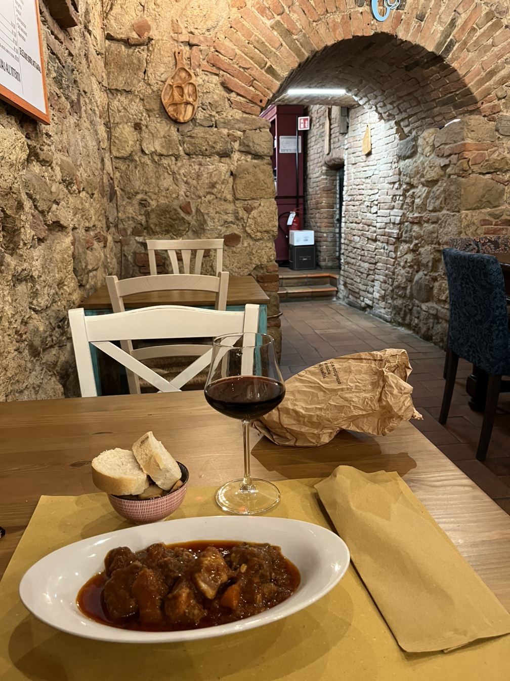 저녁시간까지 기다렸다가 그럴듯한 식당에 가서 토스카나에서의 마지막 저녁을 즐겨볼까 하다가, 갑자기 피곤이 몰려드는 기분이다. 게스트하우스 주인장에게 추천할 곳이 있냐고 물어보니 바로 숙소 근처에 거의 하루종일 영업을 하는 간이식당을 추천해 준다. 내가 좋아하는 이탈리아 메뉴는 ‘오늘의 메뉴’와 ‘주방장 추천’이다. 이번엔 주방장 추천요리. 묻자마자 자신 있게 돼지고기와 야채를 푹 삶아 만든 스튜가 아주 맛있다고 한다. 과연 토마토 베이스에 따뜻한 스튜가 입맛에 잘 맞았다. 남은 소스는 빵에 찍어서 바닥까지 깨끗하게 긁어먹었다. 이런 나를 본 주방장이 엄지 척을 한다.