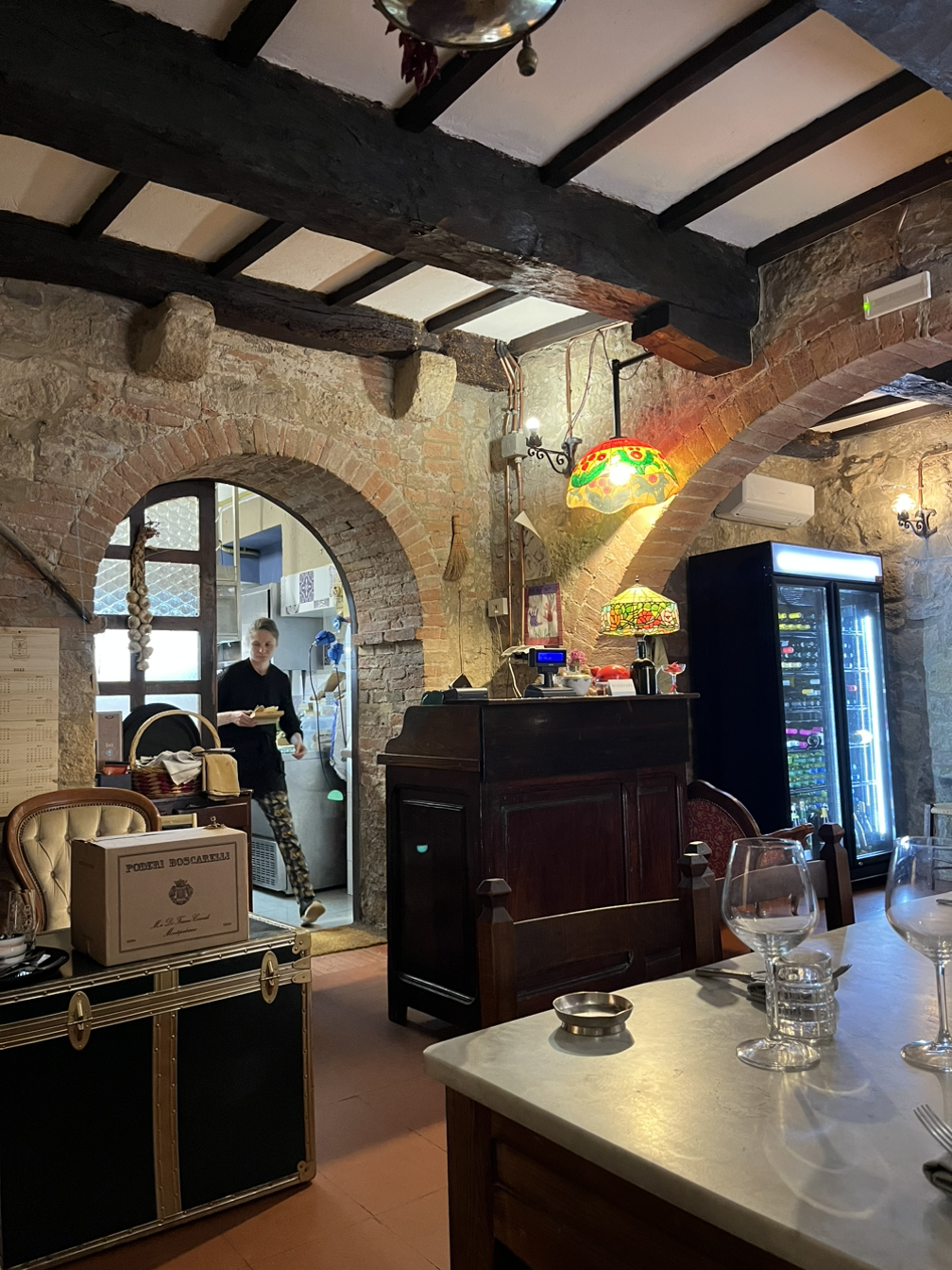 조금 더 올라가니 식당이 금세 또 보인다. 건너편에도 식당이 있다. 아니 이 조그마한 마을에 식당이 꽤 많이 있네. 게다가 식당 하나는 만석이라니. 다행히 이곳 식당은 마을 분위기와 닮았다. 내부는 단단하고 두툼한 기둥과 그것들을 잇는 아치 Arch로 투박하게 장식(?)되어 있다. 그렇지. 토스카나의 식당이라면 이런 분위기가 제격이지.