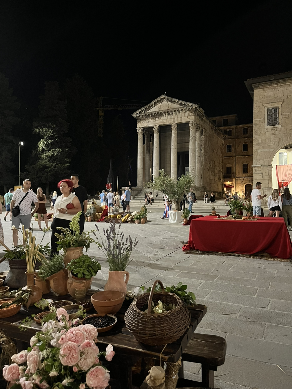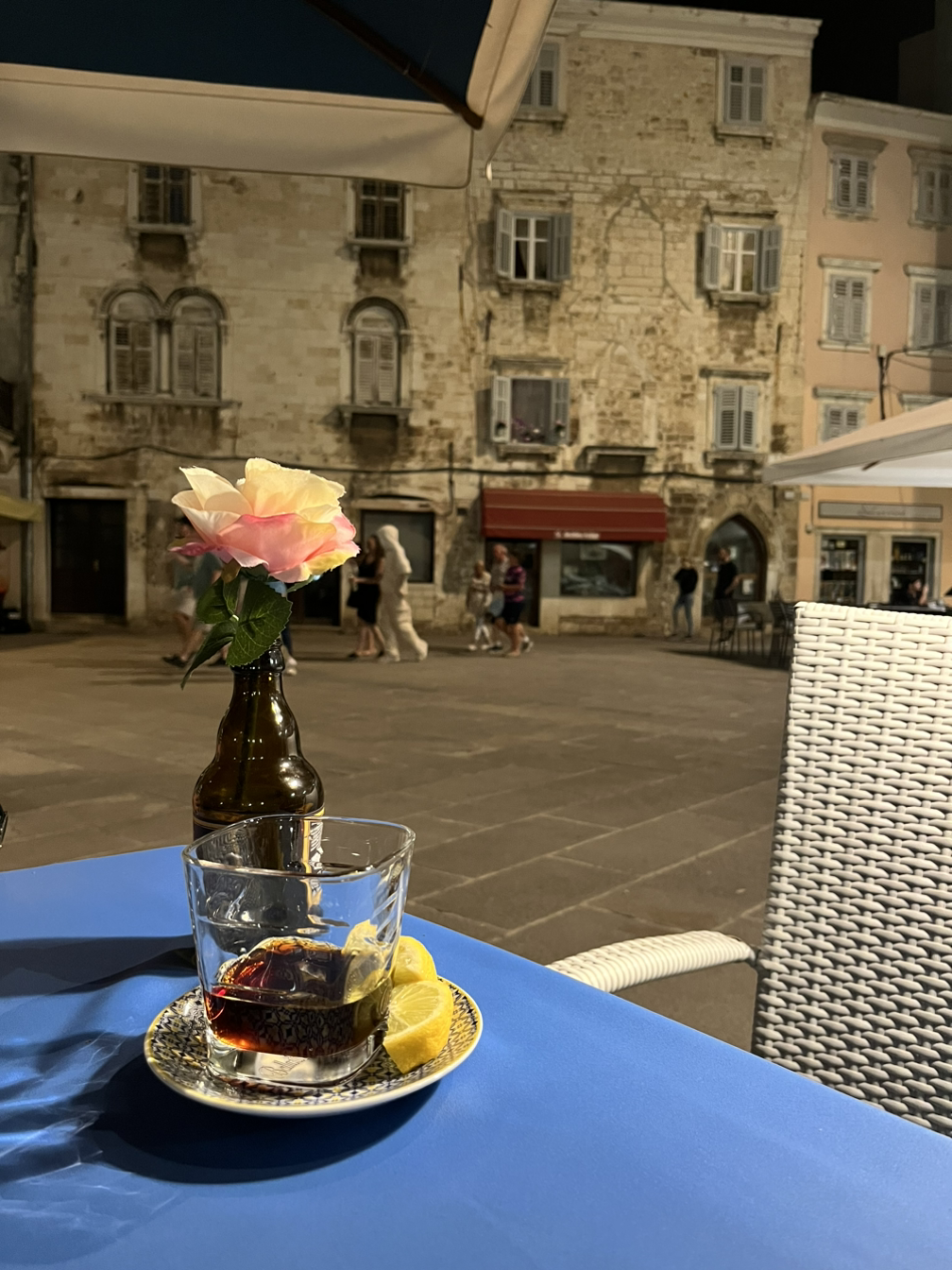 브라티슬라바에서 가져온 와인도 한 병 나누어 마시고, 이렇게 행복한 저녁식사를 하고 났더니, 신기방기하게도 다시 기운이 회복되었다. 풀라의 마지막 밤인데 숙소에만 있을 수는 없지. 신전 앞 광장에 가서 칵테일도 한 잔 하면서 풀라에서의 마지막 밤을 아쉬워하고 있다.