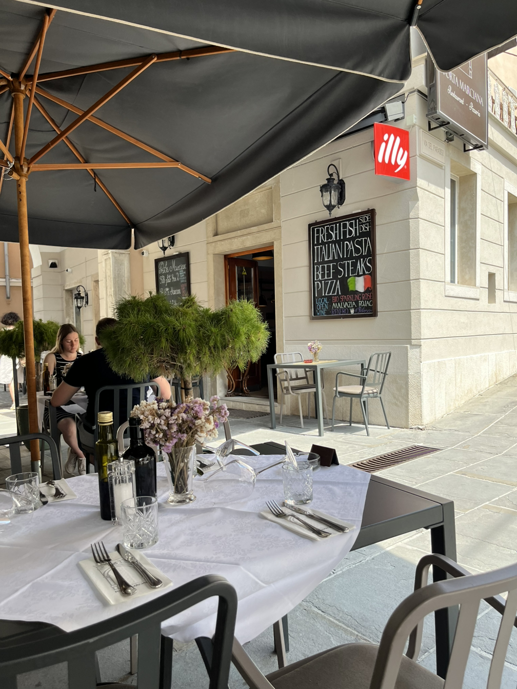 나중에 합류한 지금사진과 마을로 내려가는 중에 성당과 베네치아 탑을 본 지금사진. 지마음이 나에게 속삭인다. “지금사진님, 백 퍼센트 탑에 올라갔다 올 거예요”. 지금사진에게는 우리는 광장으로 내려가 있겠다고 하고 헤어졌다. 광장 주변의 식당 중 가장 괜찮아 보이는 곳에 자리를 잡고 일단 시원한 음료를 원샷하고 나니 이제야 주변이 눈에 들어온다. 벼룩시장이 보인다. 으음. 불안하다. 한참을 기다렸는데도 지금사진이 오지 않는 걸로 봐서는 탑에 올라갔나 보다.