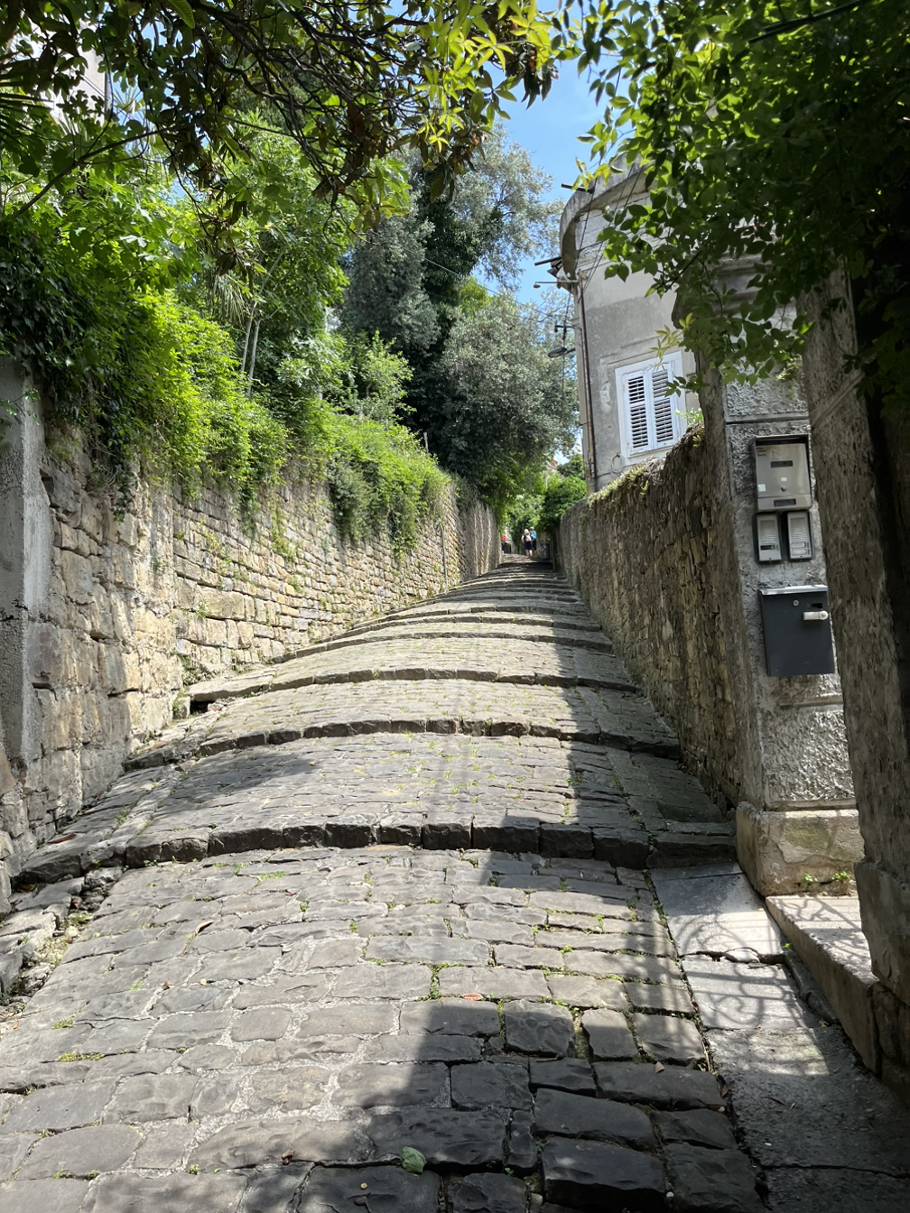 아무튼 셋이서 시장을 구경하고, 직접 만들었다고 주장하시는 영감님에게서 그라빠도 몇 병 사고 와인도 몇 병 샀다. 살짝 맛을 본 그라빠는 이탈리아의 그것보다 훨씬 더 강렬한 풍미에 깜짝 놀랐다. 그라빠는 식후에 소화를 돕는다는 핑계로 딱 한잔 하는 술이다. 40도에 육박하는 독주이지만, 포도로 만들어서일까, 꽤 향이 좋은 술이다.(물론 개인적인 생각이다) 지금사진 그라빠를 아주 소중하게 안고 있다. 골목구경을 한 후, 주차장으로 돌아가는 ‘지름길’. 시작부터 끝까지 언덕길이다. 확실히 동유럽에서의 지름길은 만만하지 않다는 느낌이다.