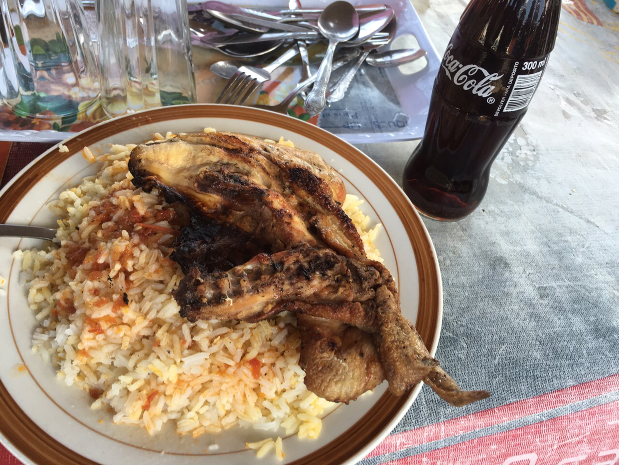 어디가냐고 묻기에 카텐비 섬에 간다고 했더니 자기 집이 그곳이라고 자기도 페리보트 타러 가는 중이라고 하길래 같이 가기로 하였다. 그 때가 점심시간을 훨씬 넘긴 시간으로 배가 고파 Jhon에게 같이 밥먹고 가자고하니 얼씨구 좋아한다. 페리보트 타러 가는 길은 해안도로 맨 밑에 위치하는데 그 한쪽으로 허름한 밥집이 쭉 이어져있어 사람들로 복작거린다. 아무 집이나 들어가서 잔에게 메뉴를 물어보니 치킨과 밥하고 다른 것은 콩삶은거 하고 다른 것이 있길래 치킨과 밥을 시켰다. 밥 위에 구운 닭고기와 야채 채소와 토마토 슬라이스 몇 개 얹어준다. 밥값은 80MT, 콜라는 20MT로 내가 목이 말라 콜라를 두 병이나 마셔 220MT로 미화 5불 50전이다. 나에겐 싸지만 없는 사람에게 매일 사 먹을 그런 음식값도 아닌 것 같다.