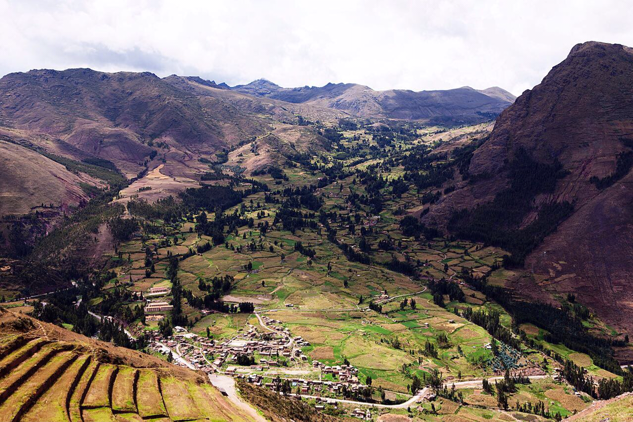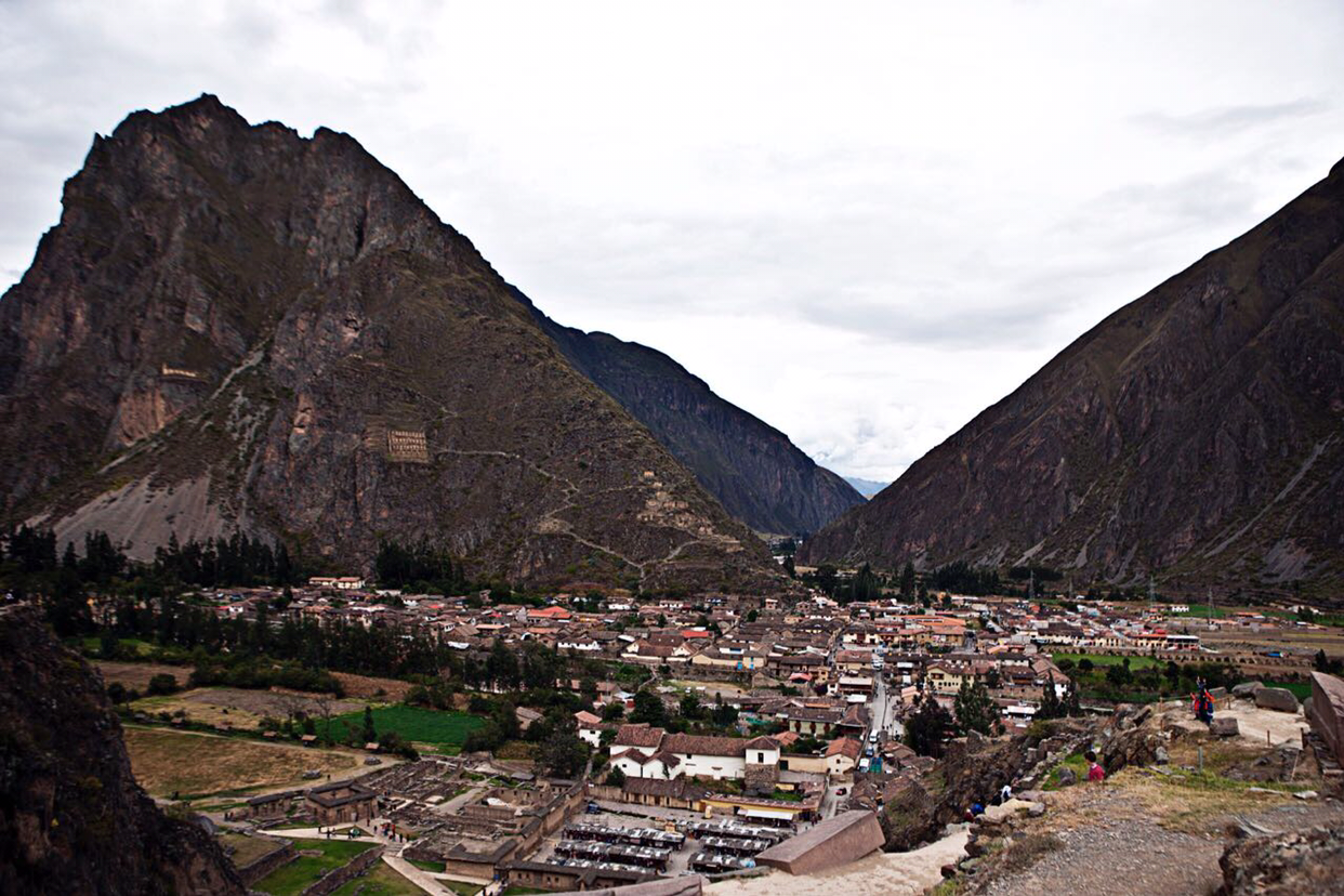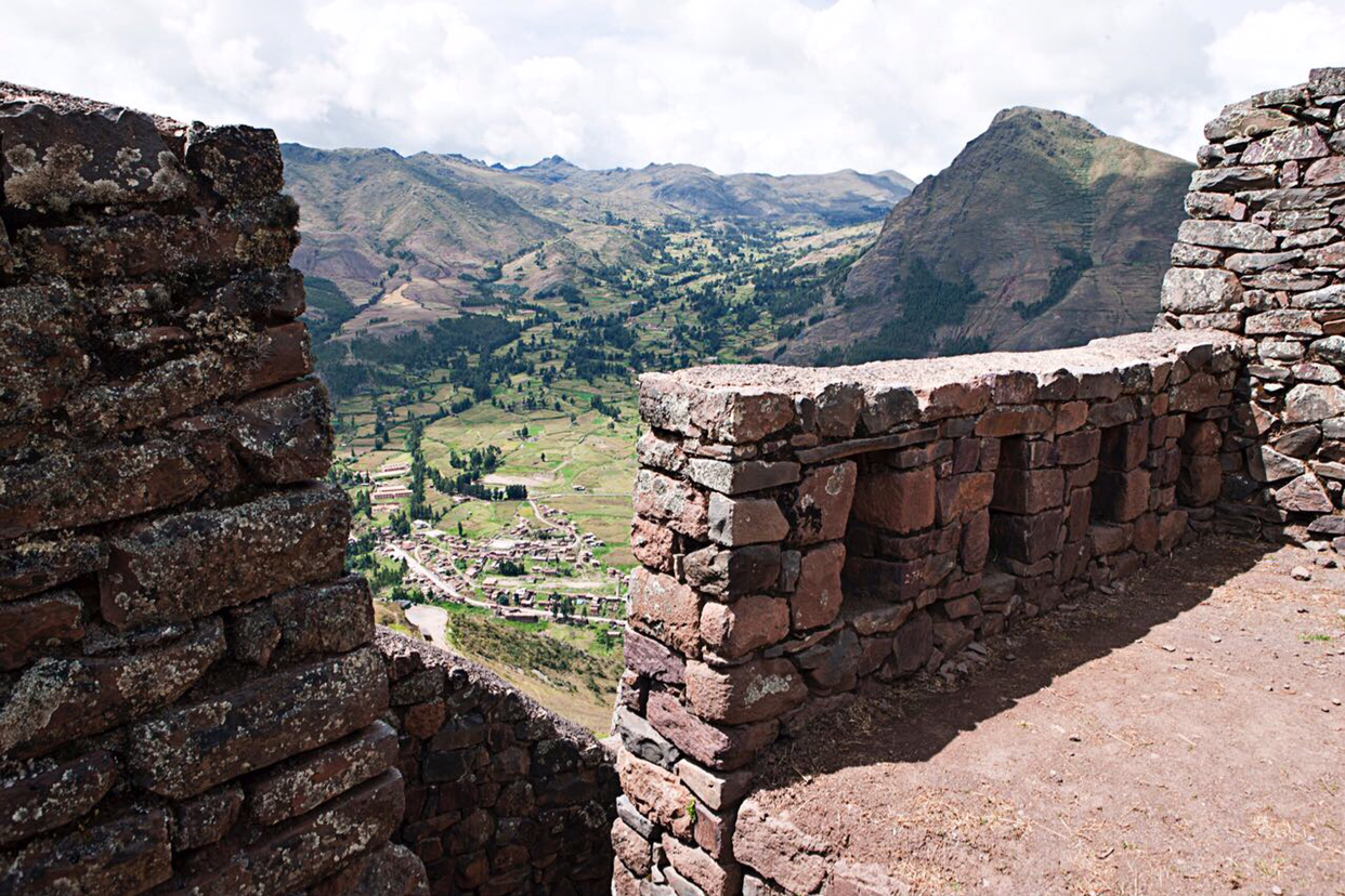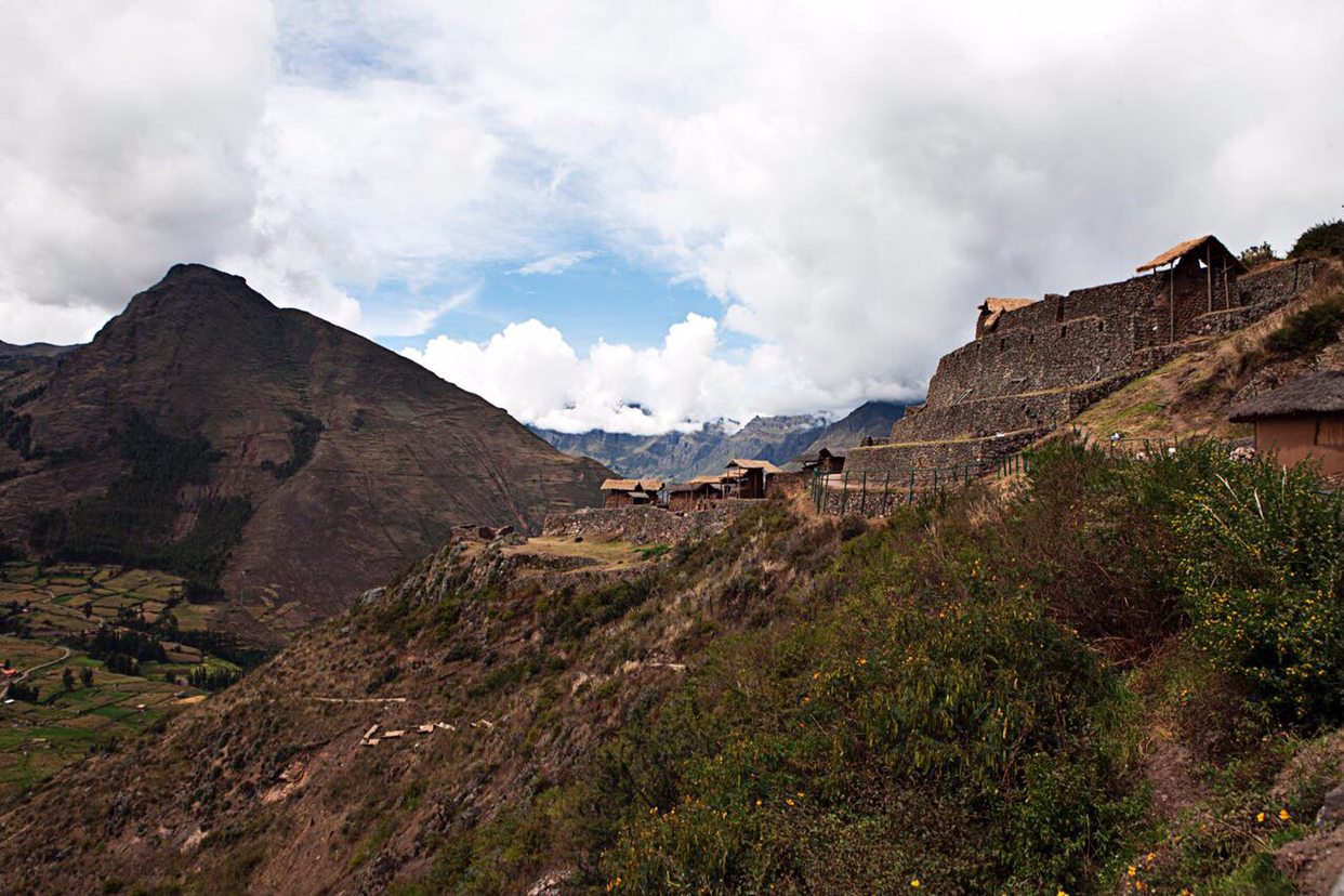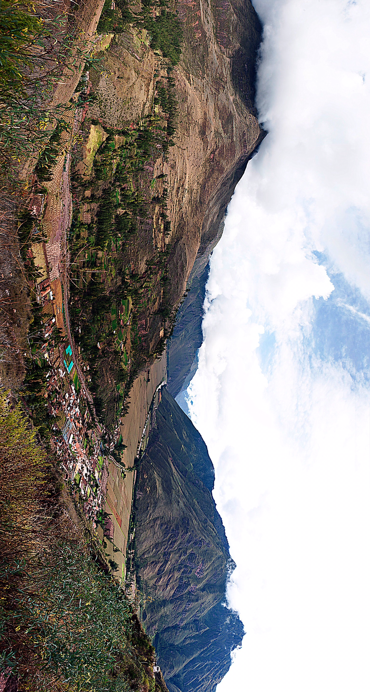 돌계단을 힘들게 발품팔아 (팔아도 뭐 들어오는 것도 없이 땀만 삐질삐질 흐른다) 정상에 올라 가면 앞 계곡사이로 들어앉은 마을이 한 눈에 들어온다. 왼쪽 산 중간에 난 길로 이어진 곳에 네모난 건물터가 보이는데 곡식창고로 추정된다고 한다. 저런 경사난 산중턱에 창고를 지어야만 하는 것일까. 잉카시대의 마을 양식, 주택 스타일이 남아 있는 이 마을에서는 그 옛날의 관개용 수로나 하수도가 지금도 이용되고 있다고 한다. 튼튼하게 잘 만들어 놓았다는 이바구다.