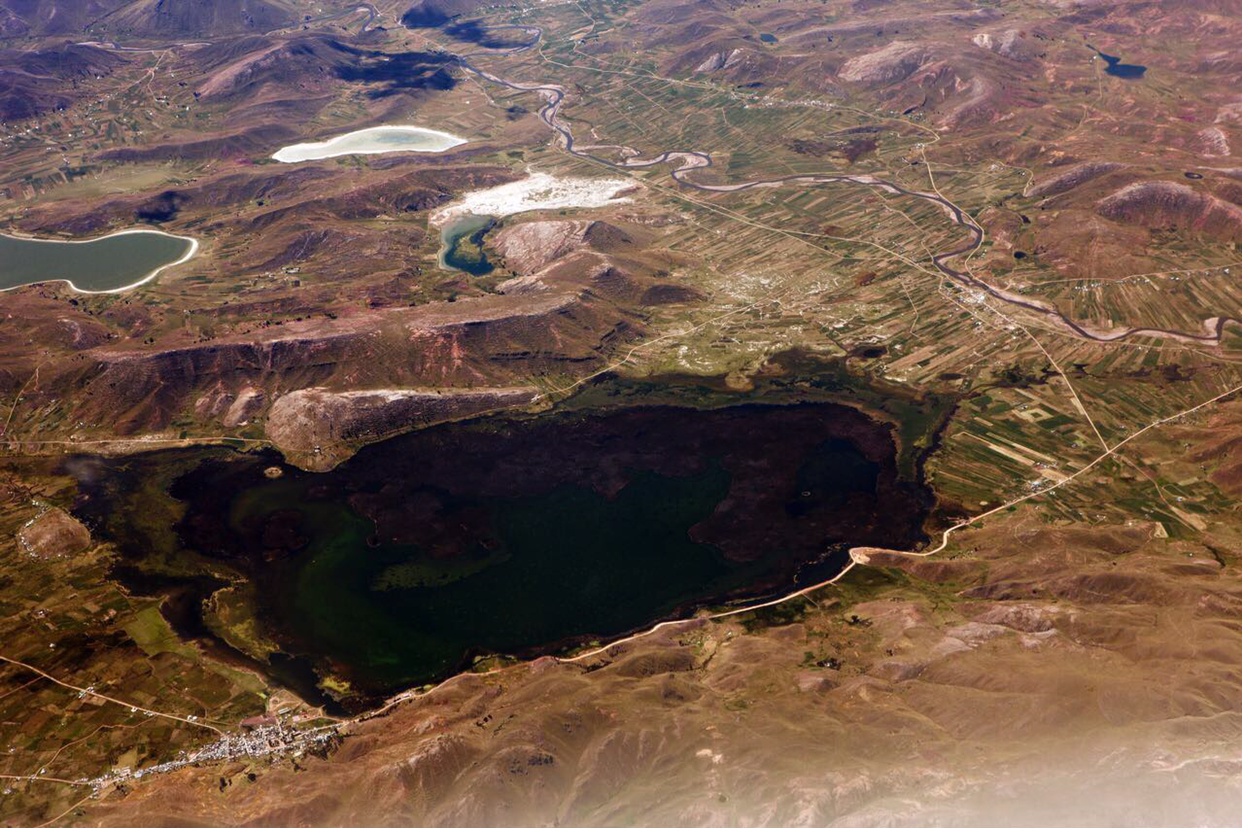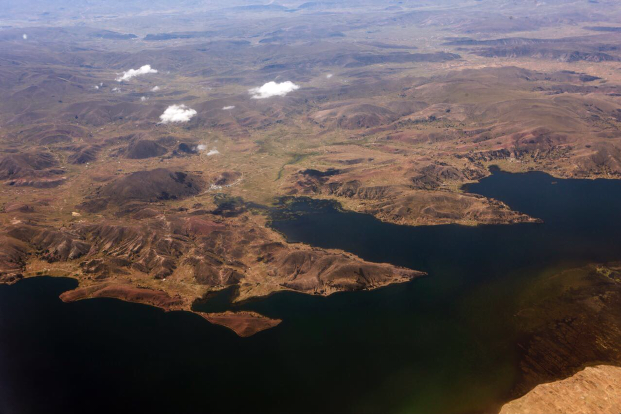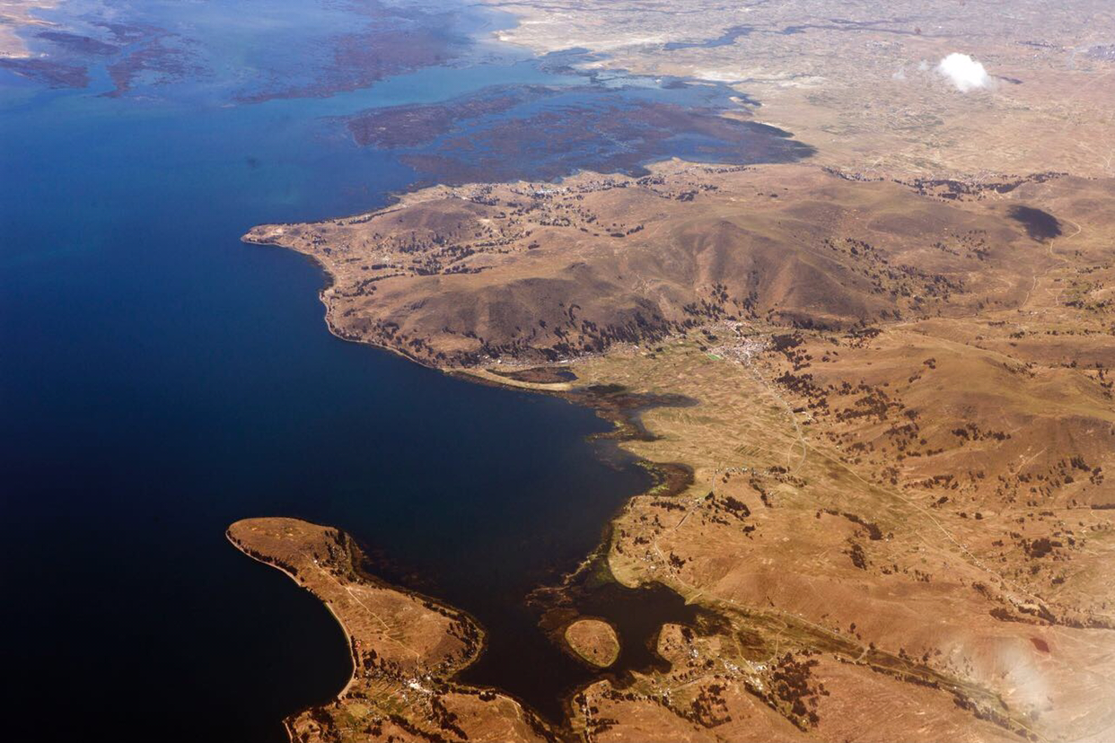 볼리비아 산악지대의 항공사진. 커다란 호수를 앞에 두고 작은 촌락이 형성되어있고 이들을 연결하는 작은 길들이 이곳저곳으로 이어지고 있다.
