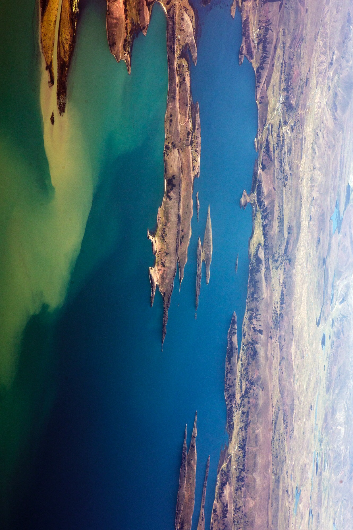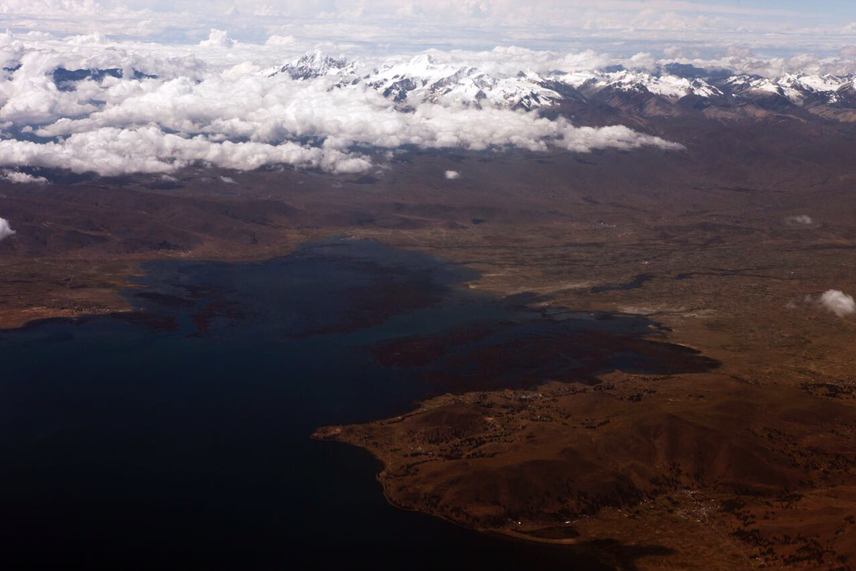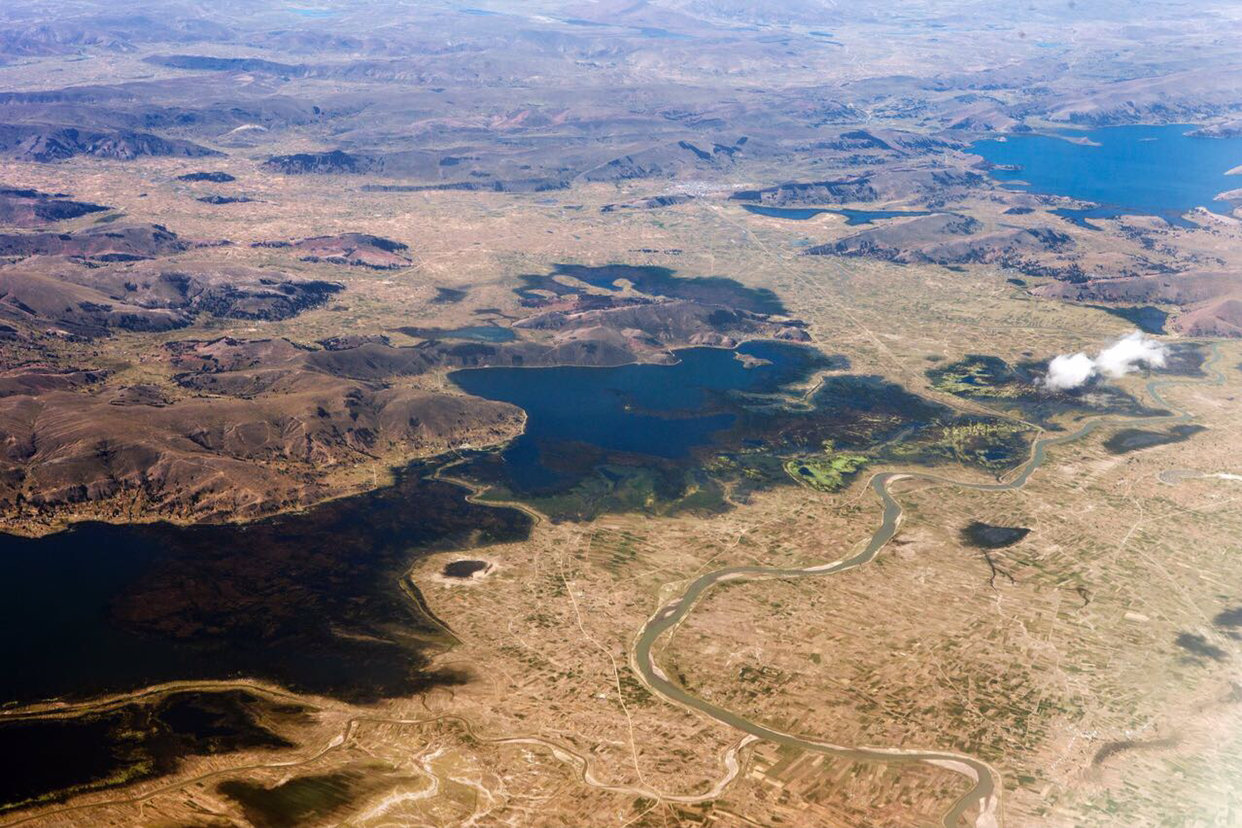 볼리비아 산악지대의 항공사진. 커다란 호수를 앞에 두고 작은 촌락이 형성되어있고 이들을 연결하는 작은 길들이 이곳저곳으로 이어지고 있다.