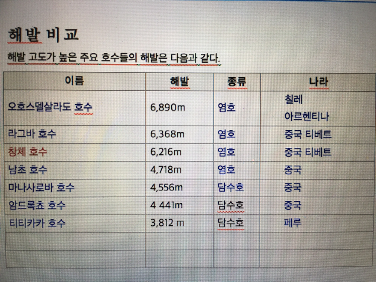 참고로 세계에서 높은 고도에 위치한 주요 호수를 일람해보면 위와 같다. 암드록쵸호수가 티벳지방에 있는 유명한 담수호수다.