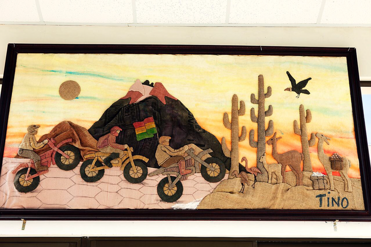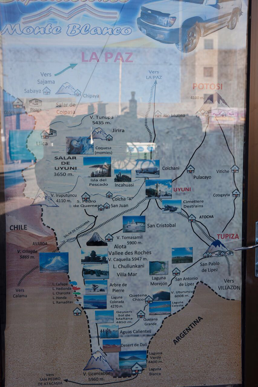 투어회사에 걸린 관광안내도. 유유니가 볼리비아 중간쯤 위치하고 2박3일 투어는 하루 소금사막 돌아보고 둘째날 산악지대를 지나 3일째 아침일찍 칠레 국경까지 데려다 주는 것이다. 신기하게도 유유니에서는 특등,일등,이등,3등 클래스별 투어 상품은 없다. 빌 게이츠같은 부자가 오건 가난뱅이 배낭 여행자가 오던 모두 토요타 랜드크루즈로 2박 3일동안 먼지만 졸나게 마시면서 이동한다는 것이다. 단, 예외는 이런거다. 한차에 80불짜리 6명 싣고가니480불 버니까 돈많은 여행자가 와서 혼자 480불내고 2박3일동안 전세투어할 수는 있다. 지금까지 내가 가 본 여행지중에서 유유니 사막투어만큼 사회주의처럼 투명한 공정성이 엿보인 곳은 없었다. 가히 만민평등주의라 할 수 있겠다. 말이 조금 통하는 투어회사(회사라기보다 SHOP)에 내일 출발하는 걸로 해서 예약하고 일찍 게스트하우스로 돌아가서 들어누웠다. 페루 리마에서부터 따라오는 감기끼때문인지 3660미터 높은 고도를 자랑하는 유유니에 적응을 못해서 그런건지 머리가 아파 진통제 먹고 꿈나라로 가버렸다.-JH-