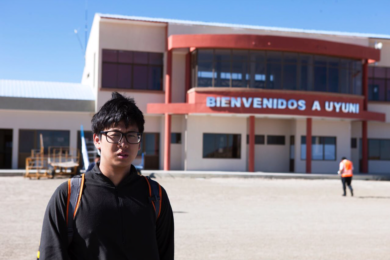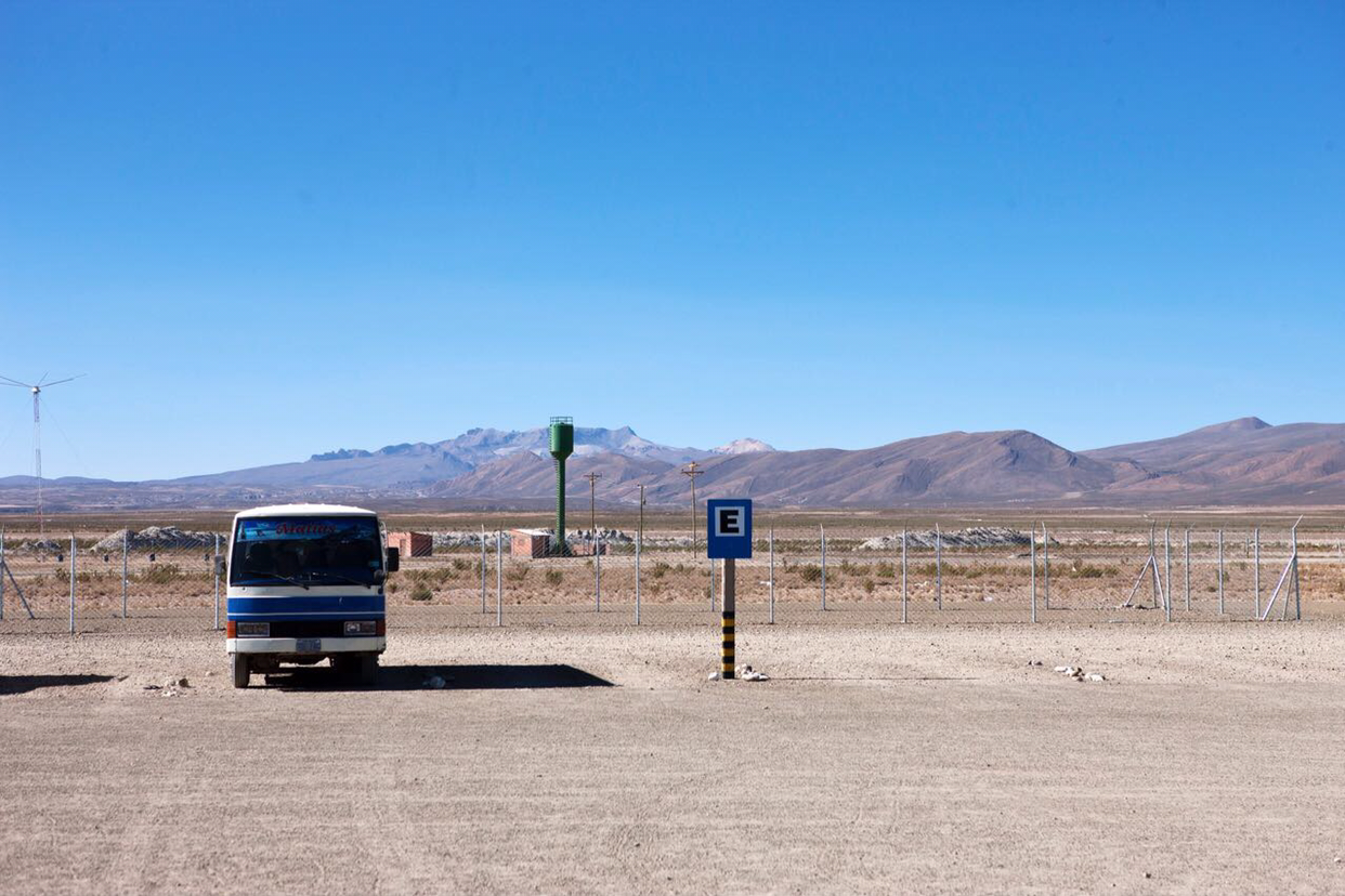 모델 K의 볼리비아 유유니 공항 인증샷 . 도착하니 오후 2시도 안된 대낮이다. 공항같지도 않은 유유니 공항에 내려보니 환전할 곳이 없다. 물어보니 시내까지( 시내라 해봐야 코끼리 콧구멍만 하다) 가려면 택시나 버스로 나갈 수 있단다. 배낭여행자이니 당근 버스를 타야지.