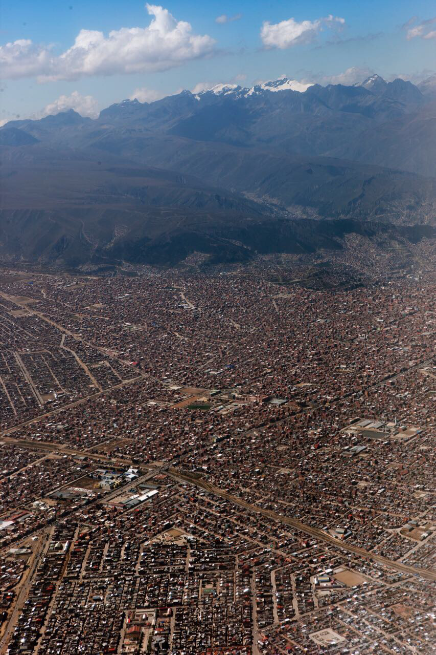 뱅기에서 내려다본 라파즈. 표고 3650미터로 수도 도시중 세계에서 제일 높은 곳에 위치한 라파즈는 볼리비아의 수도이다. 인구 약 120만명으로 그 중 절반이 인디오(원주민족)로 남미에서 가장 인디오가 많이 살고 있는 곳이라 한다. 사진 윗쪽에 보이는 눈 쌓인 산이 일리마니산(MONTANA ILLIMANI)로 해발 6402미터라 한다. 예전에 들은 이야기로 볼리비아 축구대표팀은 전력이 강하지는 않은데도 불구하고 라파즈에서 A매치 시합하면 근처 페루, 우루가이, 파라가이, 칠레 대표팀이 볼리비아팀을 당하지 못한다고 한다. 이유는 볼리비아팀들은 해발 3650미터의 희박한 공기에 이미 익숙해있기 때문이다.