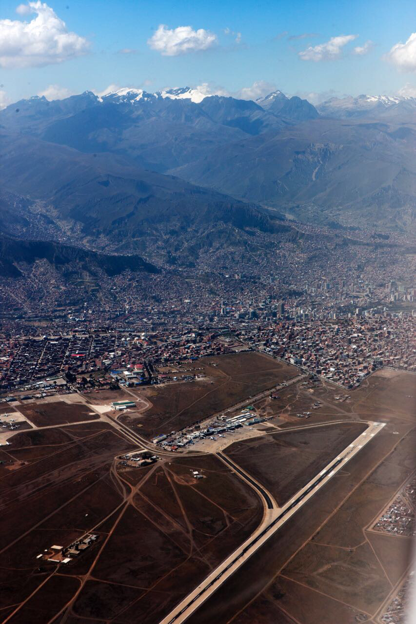 볼리비아 라파즈 공항 항공사진. 라파즈에서 입국 수속을 할 때보니 유유니로 연결되는 뱅기시간이 얼마 남지 않았는데 입국수속이 더뎌 애를 태우고 있는데 아마 쿠스코에서 타고 온 뱅기 승객중에 유유니로 바로 가는 관광객은 우리 둘 뿐인지 승무원은 빨리 하라고 재촉한다. 시간걸리는 것은 입국서류를 기재하는 것인데 별별 질문이 빽빽히 적혀있어 그것을 기재한다고 시간이 걸린다. 일인당 거금 미화 140불씩 내고 여권에 비자받아 가지고 유유니행 탑승창구로 승무원과 함께 잽싸게 뛰어갔다. 아뿔싸. 해발 3650미터 고지에서 우리들도 볼리비아 축구팀처럼 달음박질도 해보았다. 숨이 턱에 턱턱 걸리는 것은 두말할 나위도 없다. 그렇게 시간에 촉박하게 유유니 뱅기를 탈 수 있었다.