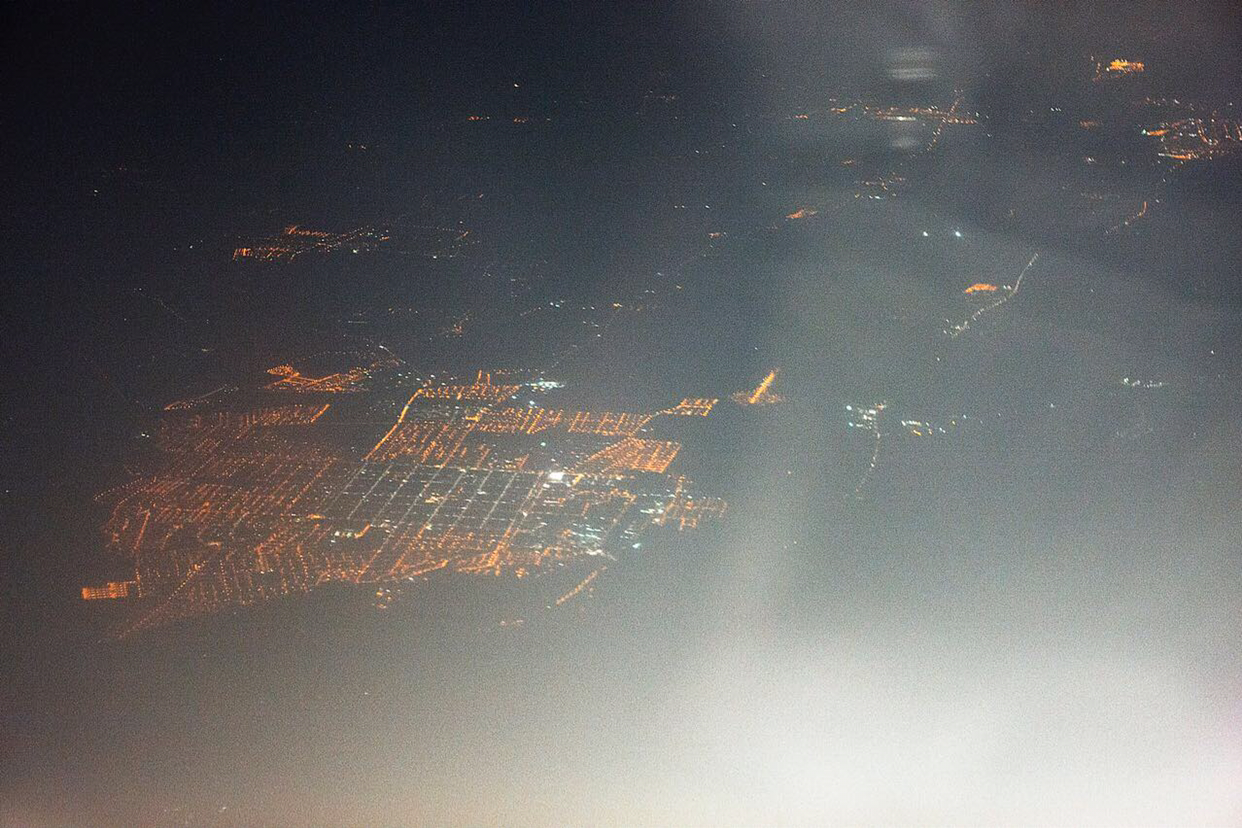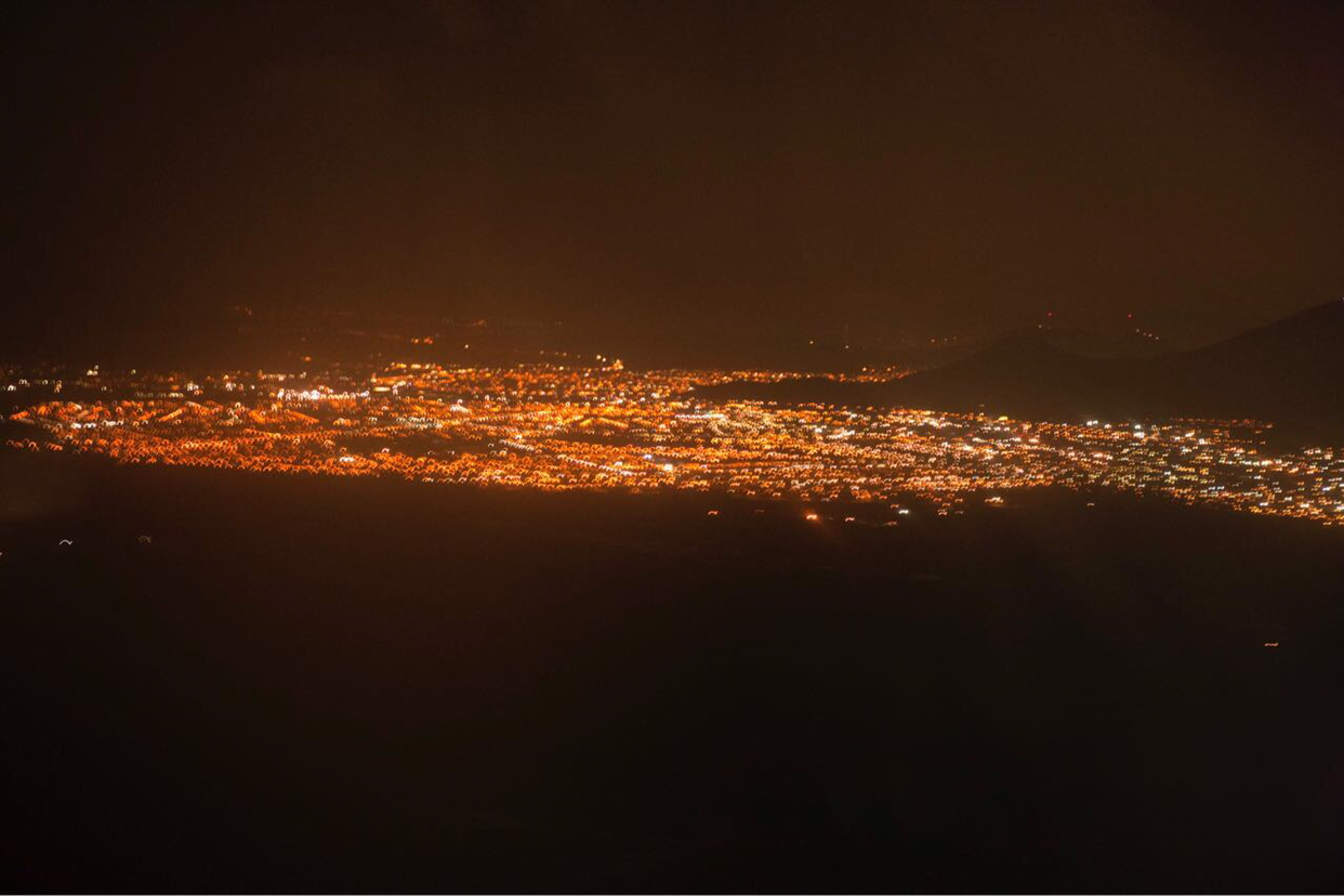 밤에 뱅기에서 내려다 본 산티아고 야경. 산티아고는 남미의 5대 도시(부에노스아이레스, 상파울로, 리오데자네이로, 리마) 속하는 대도시로 경제와 문화를 대변하는 칠레의 명실상부한 수도이다.