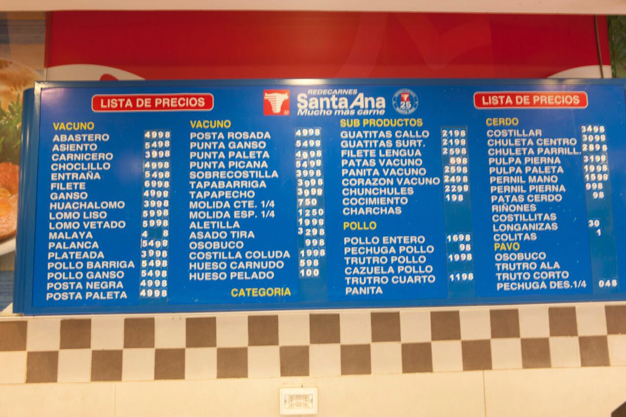 좌로부터 돼지넓적다리. 우족. 돈족의 KG당 가격을 표시. $표시는 미화가 아니고 칠레 페소로 미화 1불이 약 550칠레페소이니 우족 1kg이 미화 1불 조금 넘어니까 엄치 싼가격이다.