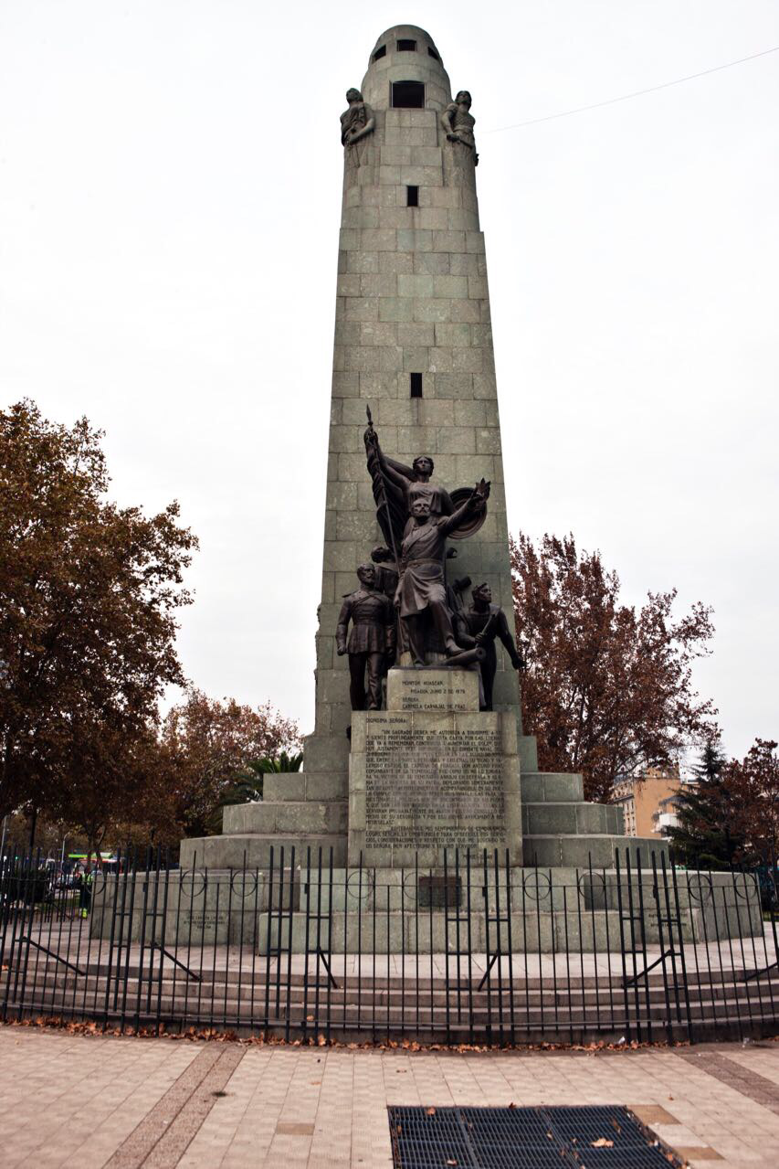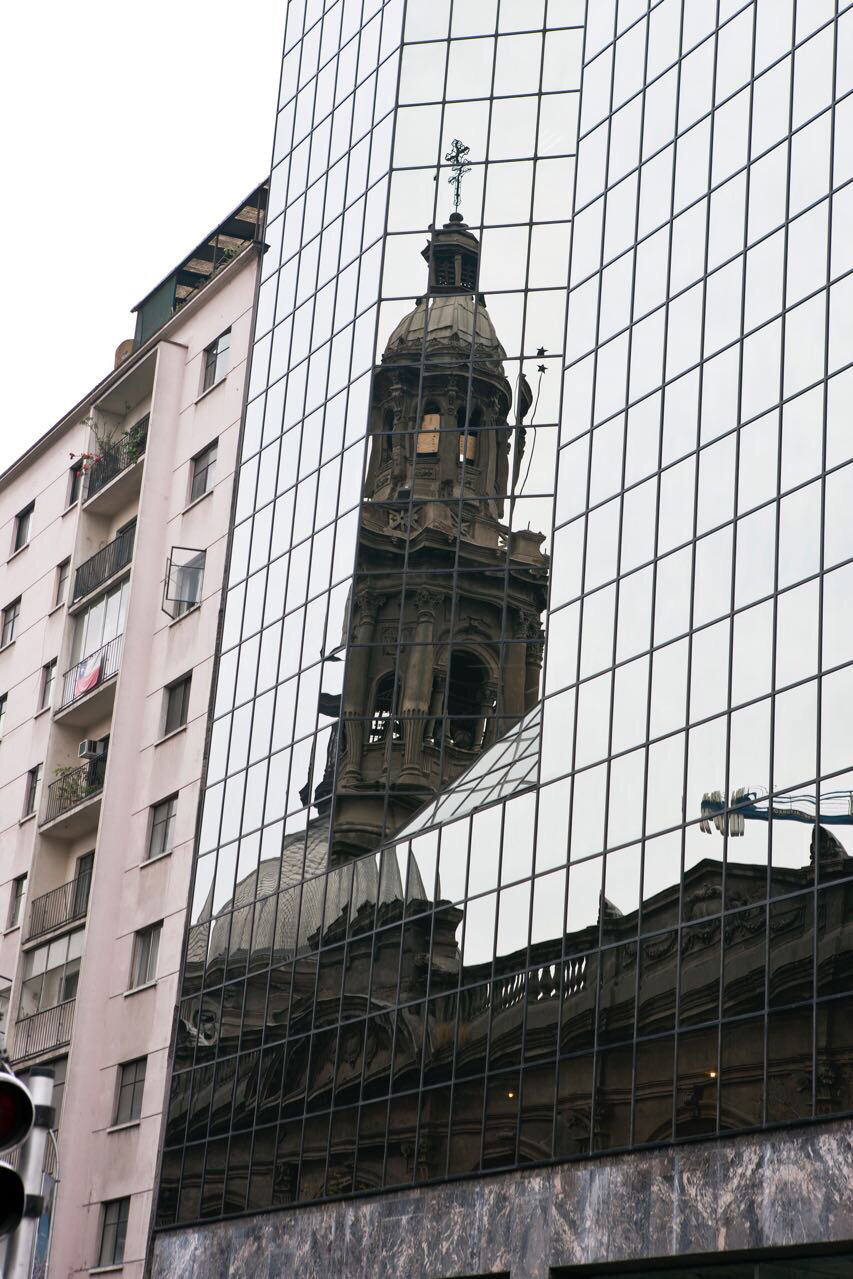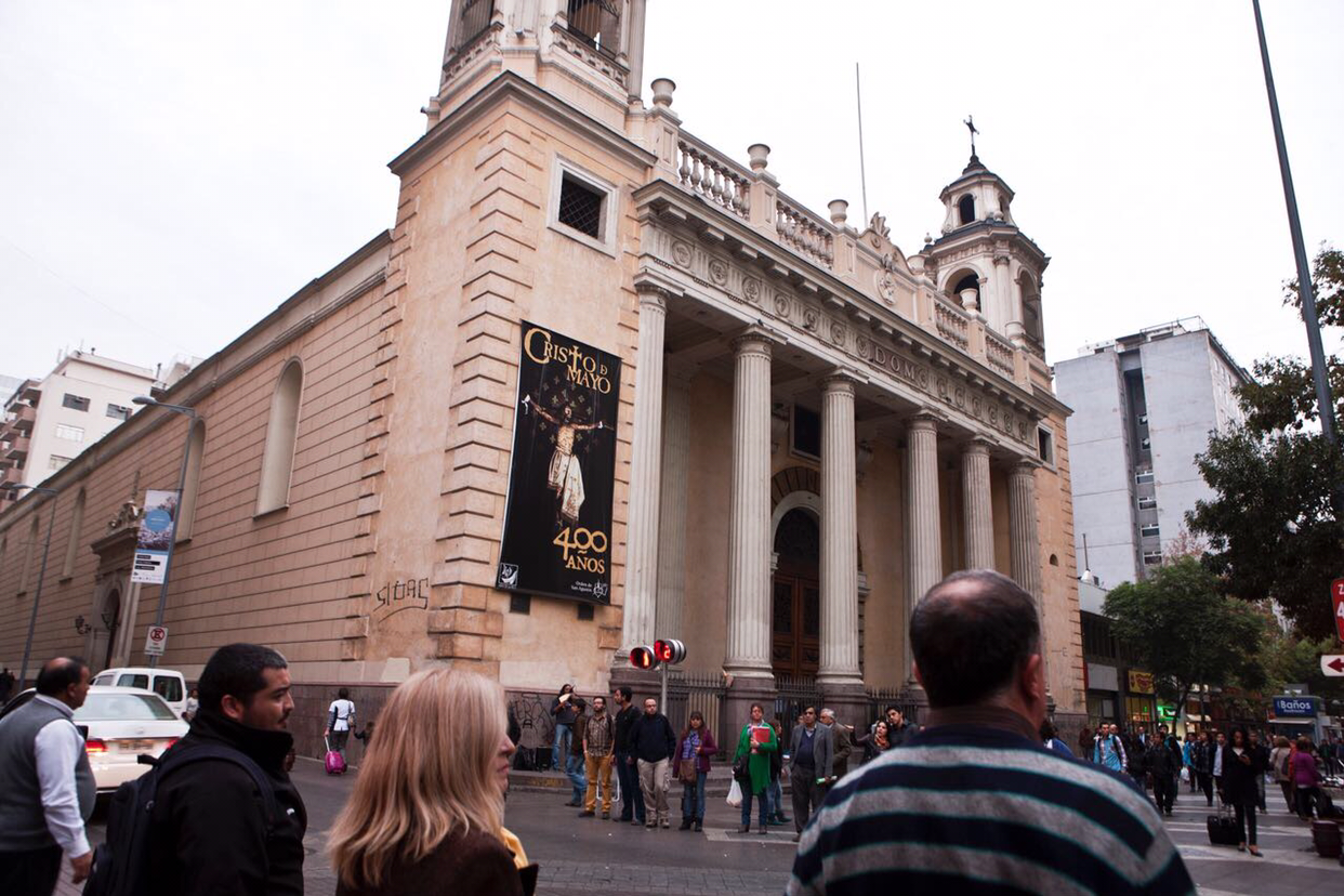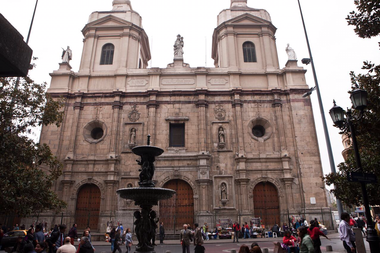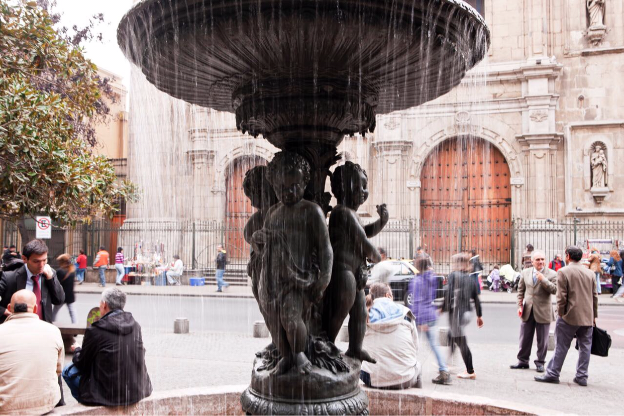 성당 앞 분수대 동상. 카톨릭 신자가 대부분인 칠레인들의 정신적인 지주로 군사독재 체제하에서도 이곳은 온건파 반군정 시민그룹의 근거지가 되었고 성당 앞에서는 항상 항의집회가 열렸다고 한다.