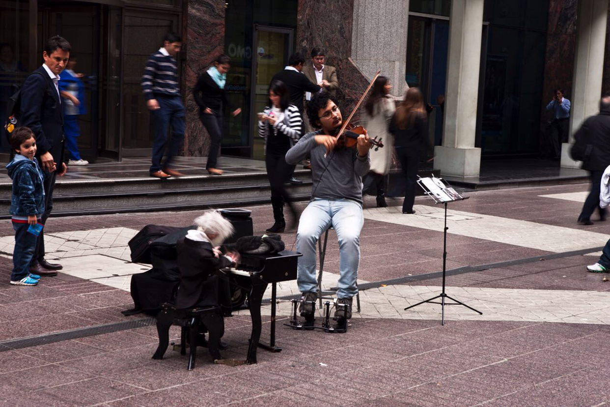 새로운 업종이다. 바이올린을 연주하면서 작은 인형이 피아노 앞에서 연주하는데 기가 막히게 협주가 된다. 지나가는 행인들이 모두들 신기하게 여기며 눈길을 던진다.