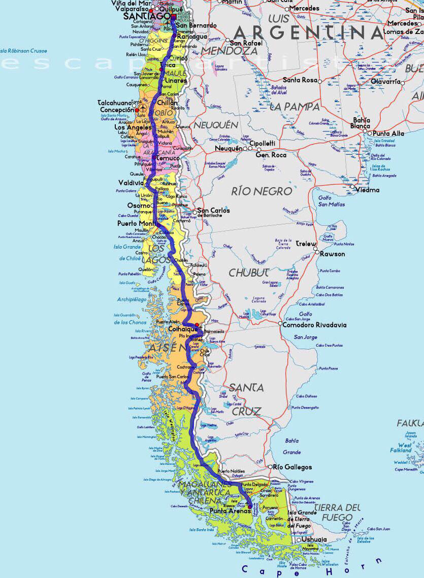 가난한 나라 페루의 보물창고가 쿠스코와 마추픽추이고 자원도 없는 빈국 볼리비아의 그것이 유유니 소금사막이라 하면 칠레의 보물창고는 바로 파타고니아이다. 파타고니아란 남미대륙 위도 40도 이남지역을 지칭하는데 지역으로 보면 푸에르토 몬트이남 지역이다. 파타고니아란 지명은 1520년 이 근방지역을 탐험한 마젤란일행들이 여기에 거주하던 원주민들의 큰발을 보고 명명한 것으로 PATA=발 GON=크다를 합성하여 파타고니아가 탄생한 것이다. 이런 파타고니아 지역도 남북으로 뻗은 안데스산맥을 경계로 칠레와 아르헨티나로 갈리는데 기후와 지형의 특성이 각각 다르다. 파타고니아 지역의 특성이 일년 내내 바람이 항상 불고 비도 많아 쾌청한 날이 드물다. 이런 기후의 특성으로 웅대한 자연의 보고가 되어 약 30개의 국립공원이 산재하고 있어 칠레쪽에는 세계적으로 유명한 트레킹 코스가 있는 국립공원이 있고, 아르헨티나 쪽에는 빙하호수 지역이 많아 많은 관광객들을 끌어들이고 있다. 보통 배낭여행객들이 많이 가는 곳이 파타고니아중에서도 남부 파타고니아인데 위도 40도 이남지역을 지칭하는데 칠레쪽에는 토레스델파이네 국립공원이 있는 푸에르토 탈레스로 가야하고 아르헨티나쪽에는 유명한 빙하호수공원인 로스글라시아레스 국립공원이 있는 엘칼라파테(EL CALAFATE)로 가야한다.