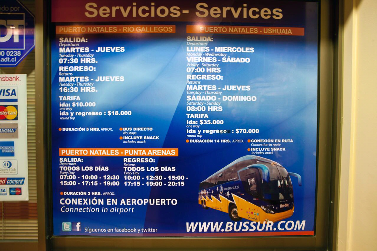 Ushuaia와 Rio Gallegos 연결 버스 시간과 요금이 나와 있다. 우리는 푼타아레나스에서 푸에르토나타레스까지 이 버스를 타고 이동하여야 한다. 오후 3시가 넘어서 버스가 출발했다.