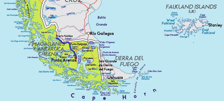 이를 조금 확대해서 보여주면 위와 같은데 국경선이 매우 헤깔리게 그어져 있다. 위 지도부분이 남부 파타고니아의 핵심부분이다. 칠레쪽에는 Punta Arenas와 Puerto Natales, 아르헨티나쪽에서는 Rio Gallegos, Ushuaia, Calafate 가 포함된다. 지도 오른편을 보면 포클랜드섬이 보인다. 예전에는 영국과 아르헨티나가 서로 자기영토라고 싸우다가 1982년 포클랜드 전쟁후 지금은 영국령으로 관리되고 있다.