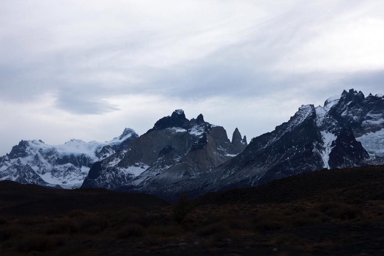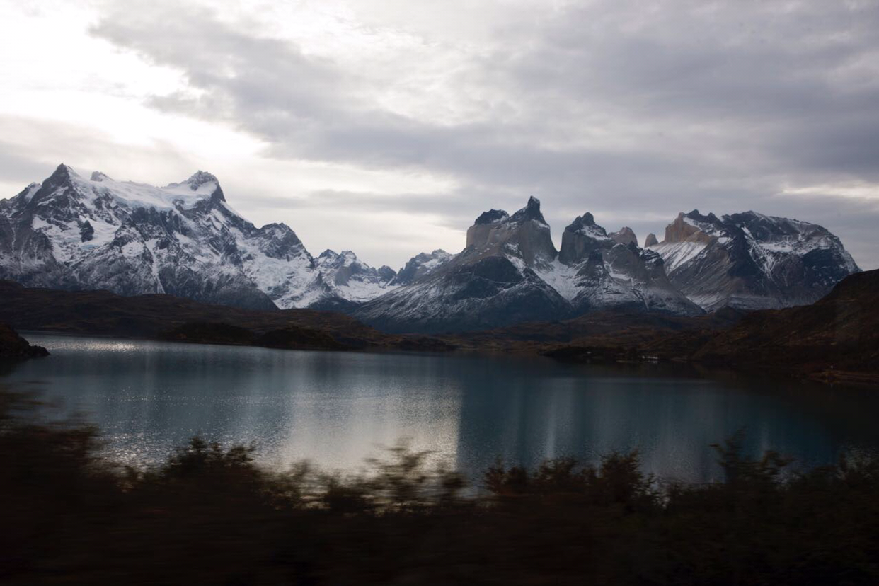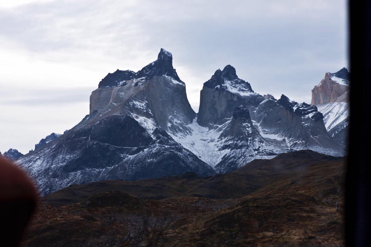 버스 창가에 비치는 토레스델파이네 풍경. 사진 오른편에 파이네 뿔이 코뿔소의 그것처럼 하늘을 찌르고 있다. 달리는 버스안에서 잡은 이미지치고는 바싹바싹하게 구운 것 같다.
