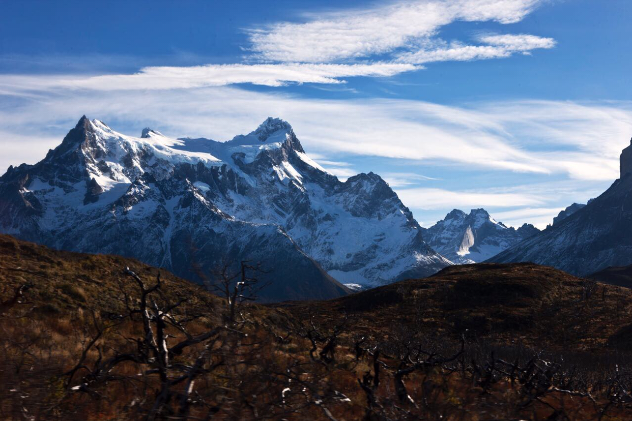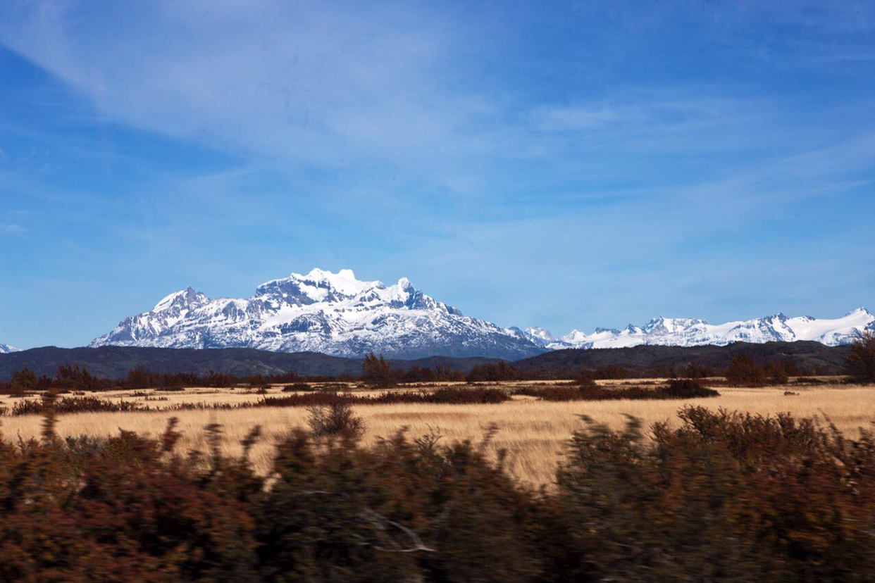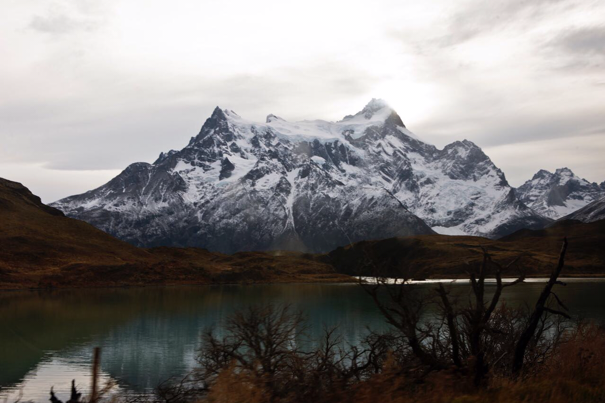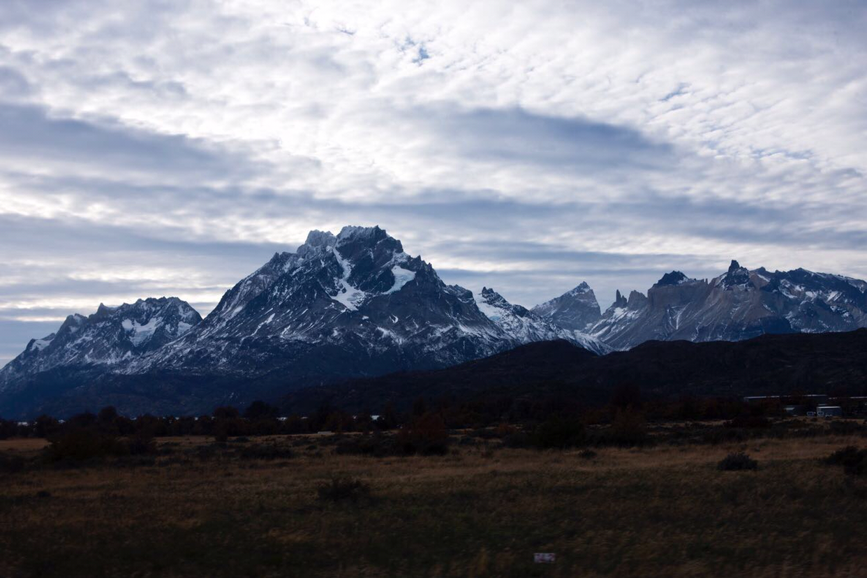 버스 창가에 비치는 토레스델파이네 풍경. 사진 오른편에 파이네 뿔이 코뿔소의 그것처럼 하늘을 찌르고 있다. 달리는 버스안에서 잡은 이미지치고는 바싹바싹하게 구운 것 같다.