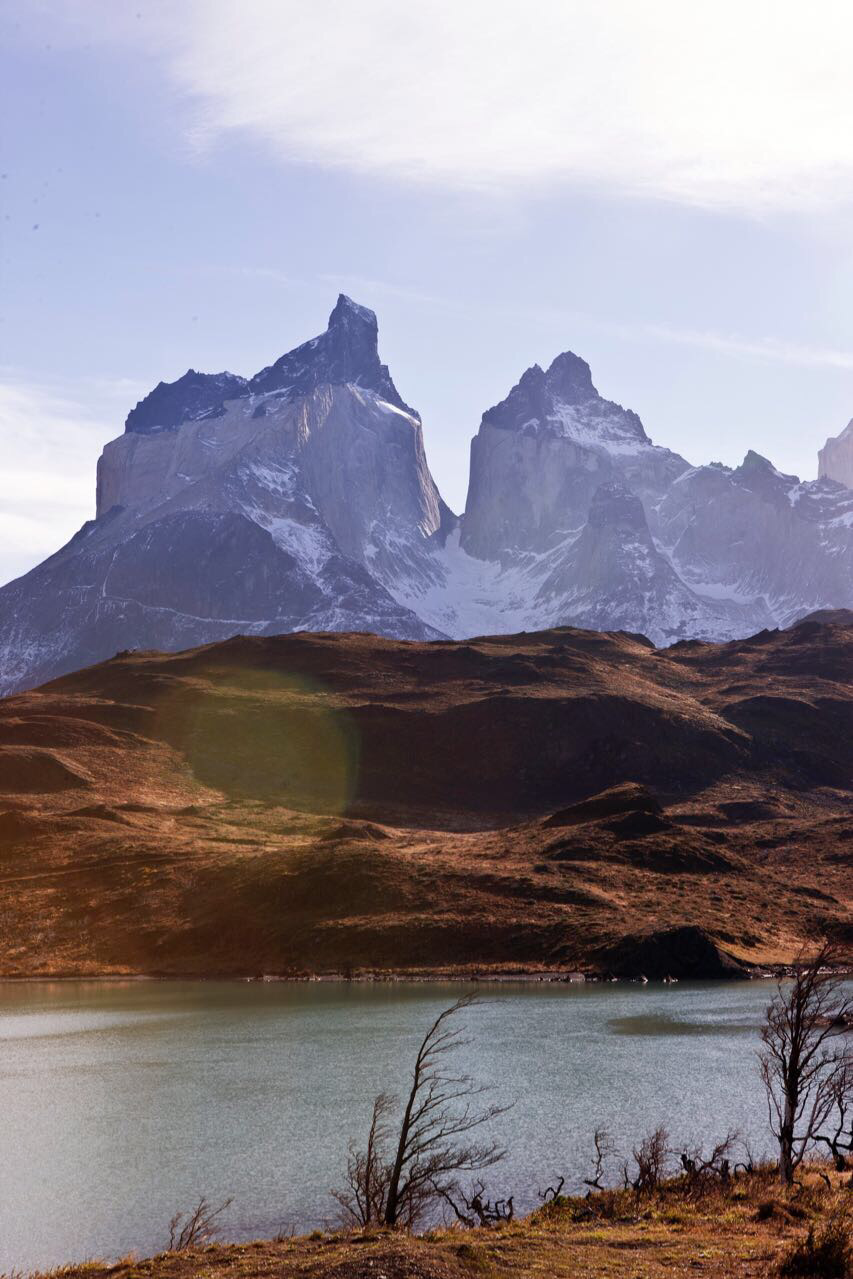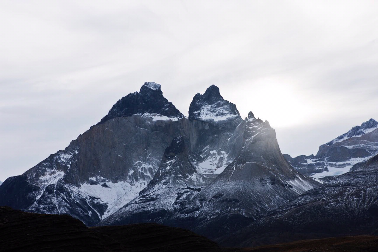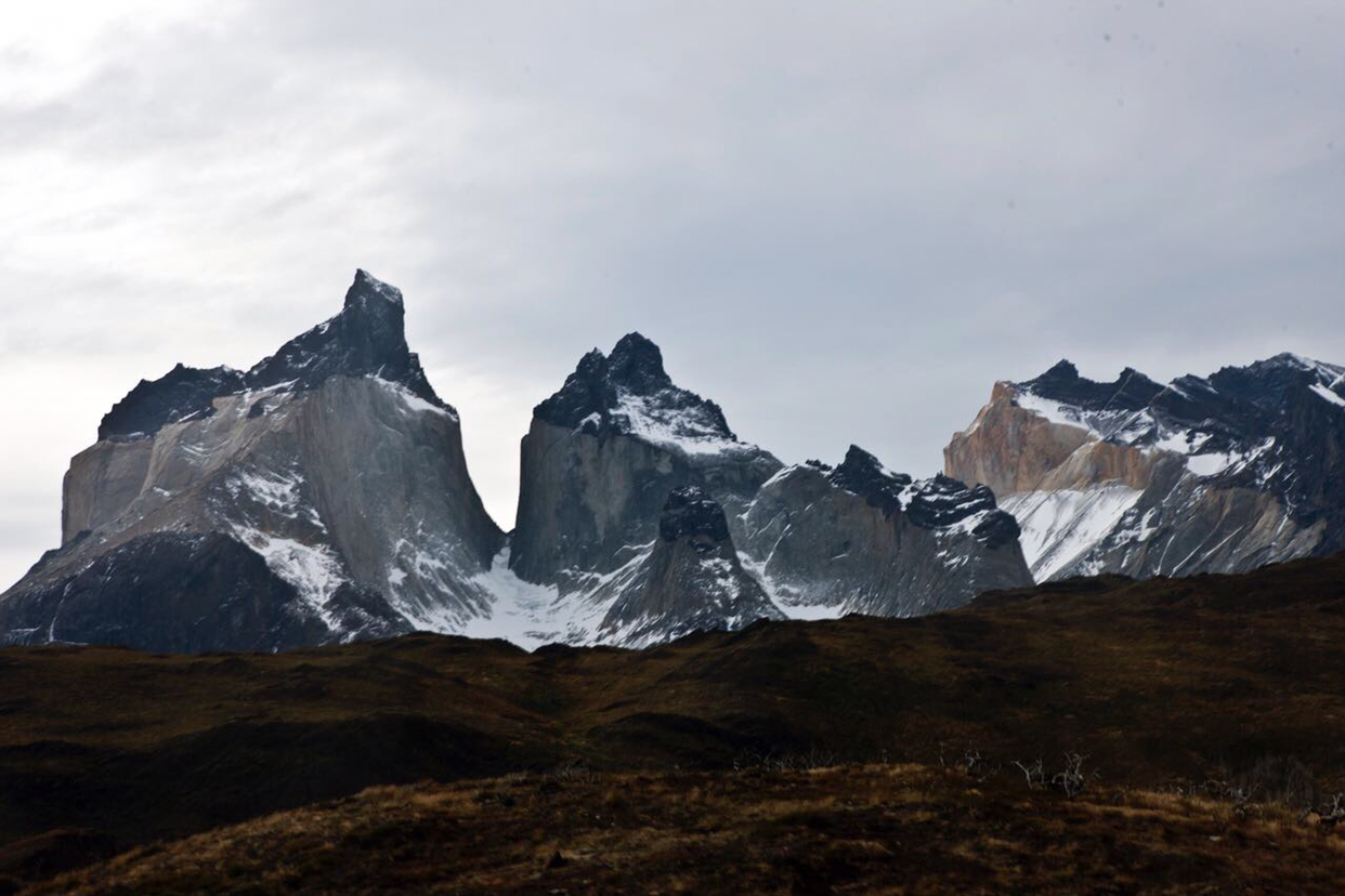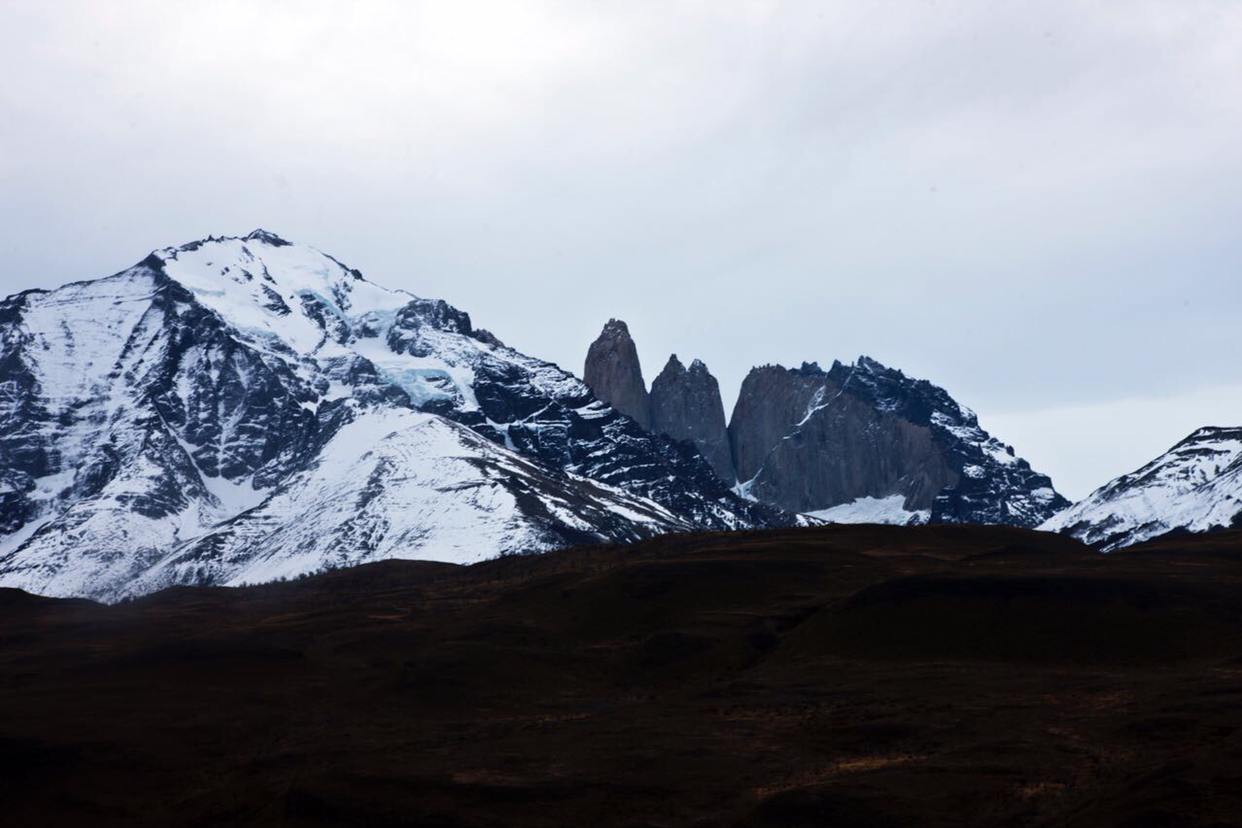 제일 가깝게 잡은 사진이지만 떨려서 촛점이 맞지 않게 되었다. 구릉 사이로 빼꼼하게 얼굴을 보이는 파이네의 뿔들로 V자 계곡에는 하얀 빙하가 선명하다. 기록을 찾아보니 첫 등정은 1957년 이탈리아 원정대가 성공했다고 한다. 제일 높은 주봉의 높이는 3,050m라 하니 백두산보다 약 300m 높은 셈이다.