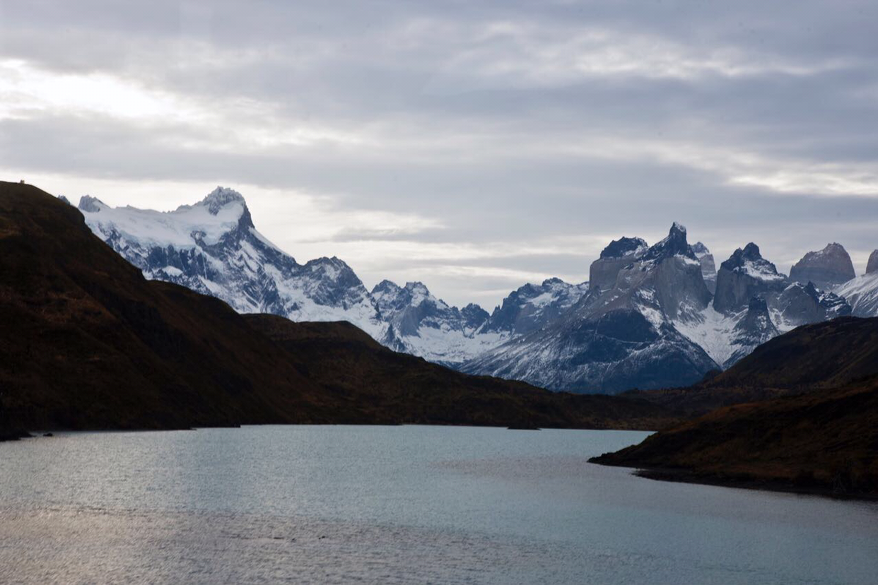 버스가 다시 돌아 나왔는지 파이네 삼봉이 멀리서 다시 보이기 시작한다. 차도로가 파이네 삼봉과 파이네 뿔을 중간에 두고 반바퀴 삥 돌게 되어있는 것 같다. 공원입구에서 들어갈 적에는 파이네 삼봉이 보이지만 뒤로 돌아가면 삼봉은 보이지 않고 파이네 뿔만 보게 된다.