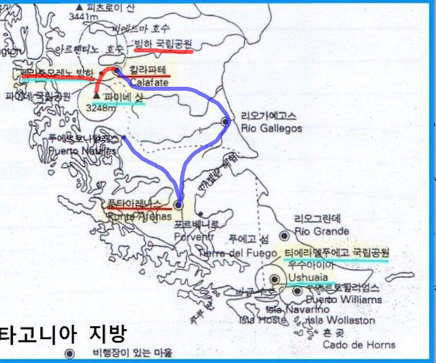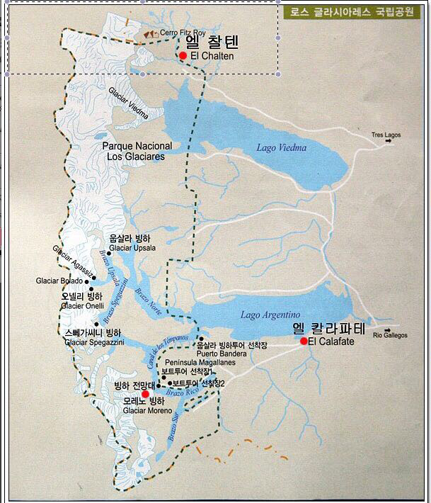 아르헨티나 빙하국립공원은 칠레 파이네 국립공원과 바로 붙어있다. 길이 없어서 이렇게 빙 둘러 가야한다. 원래 명칭은 로스글레시아레스( LOS GLACIARES) 국립공원이다. 영어의 빙하가 스페니쉬로 글라시아레스다. 어제 하루 종일 버스를 두번 갈아타고 여기 칼라파테로 온 이유가 이 빙하국립공원을 보러 온 것이다. 여기 빙하는 남극, 그린랜드에 이어 면적으로는 세계에서 3번째로 광대함을 보여주며 움직임이 아주 활발하다고 한다. 빙하지역도 넓어서 페리토모레노 빙하, 우프살라 빙하, 스페가치니 빙하, 그란테 빙하, 마요 빙하, 아가시오 빙하, 오네이 빙하등 47개 빙하가 광범위하게 분산되어 있다. 보통 시간이 없는 여행객이 보는 빙하는 페리토모레노 빙하로 투어버스로 공원에 들어가서 유람선을 타고 선상에서 관람하고 하루 더 시간을 내면 빙하투어라 해서 가이드와 함께 아이젠을 착용하고 빙하 위를 걸어보는 체험을 할 수 있다.
