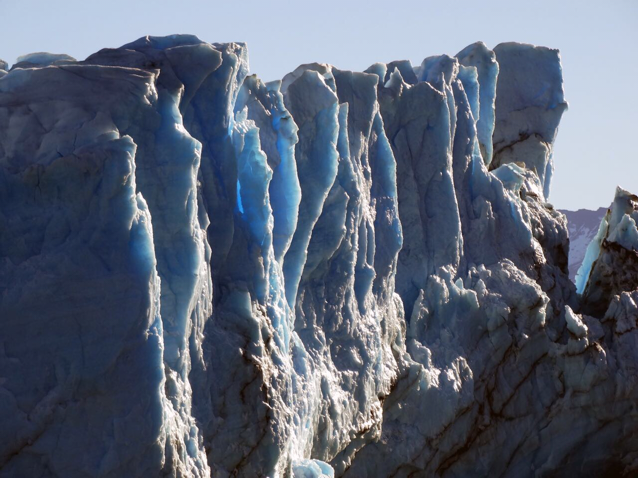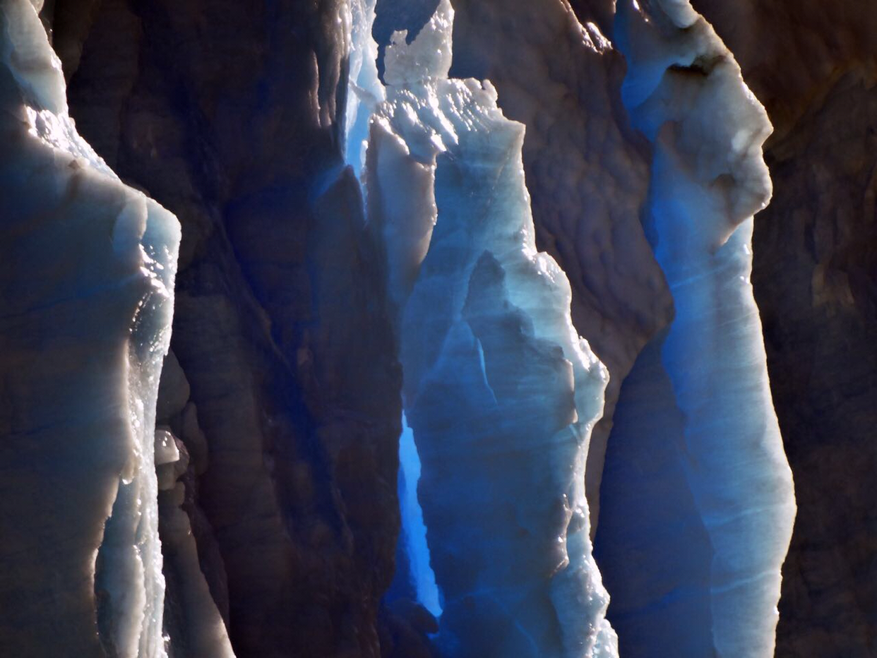 완전히 심층 구조 분석기법같이 보여주는 사진이다. 빙하속에서 푸른색이 비치는 이유는 빙하속에 들어있는 퇴적물에 푸른색을 내는 광물질이 들어있기 때문이다. 마치 빙하속에다 푸른 전구알을 넣고 전기를 통한 것 같이 선명한 푸른색을 발산하고 있다. 그런 빙하의 PAINE 푸른색이 그 옛날 내 젊음의 열정보다 더 강렬한 것 같았다. -JH-