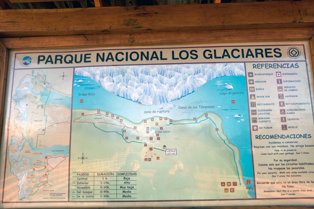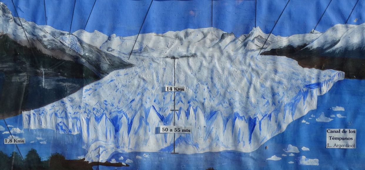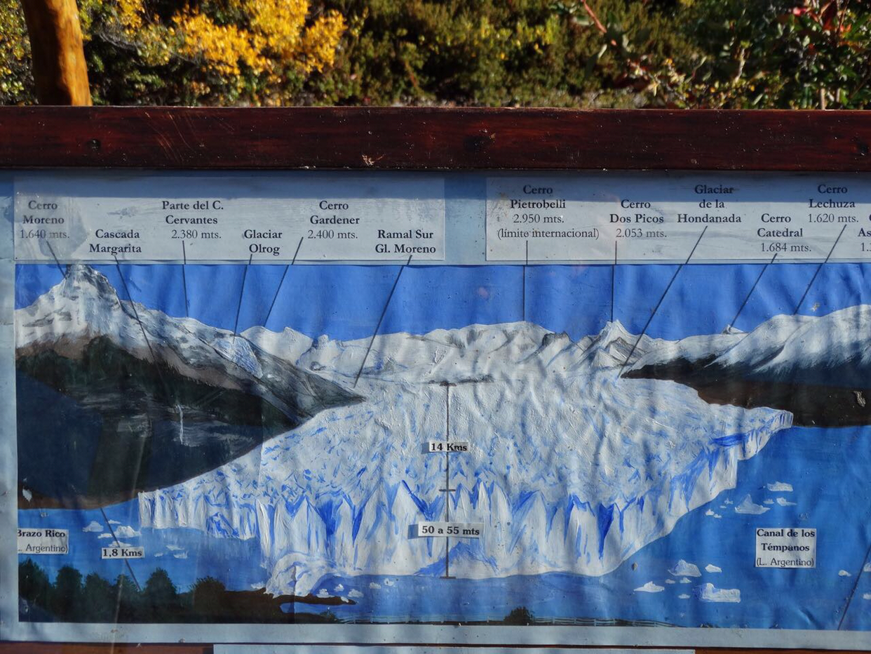 이 전망대 사진으로 페리토모레네 빙하의 제원을 설명하면 이렇다. 중앙에 14km라고 적은 것은 이 전망대에서 볼 수 있는 빙하의 길이이지만 실제로 전체 길이는 35km라고 한다. 왼쪽에 1.8km란 것은 앞에서 배를 타고 본 부분으로 그 폭이 1.8km라는 것이다.