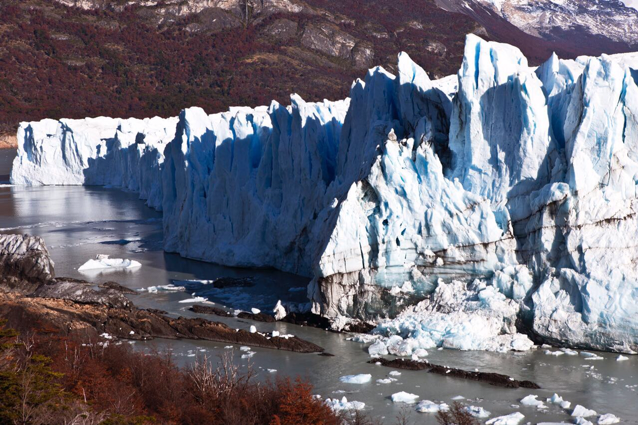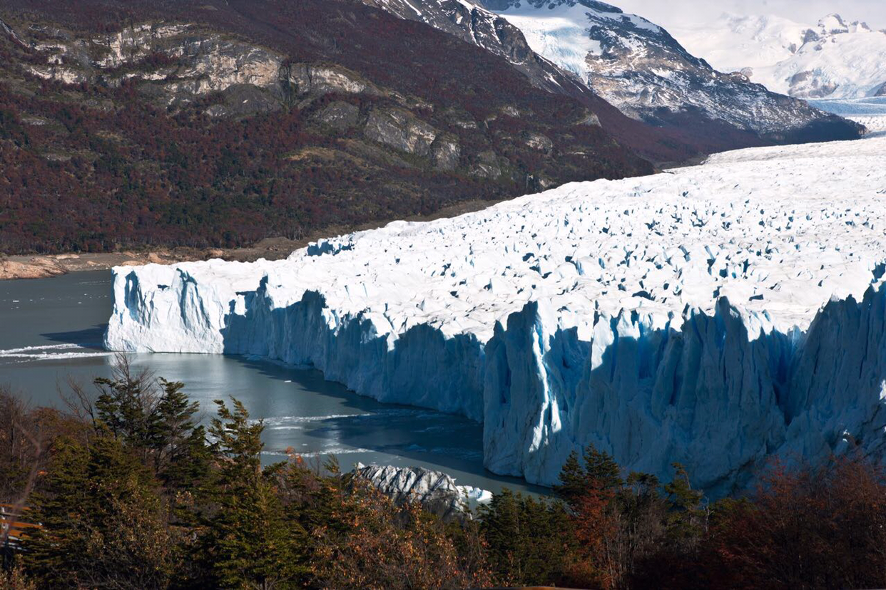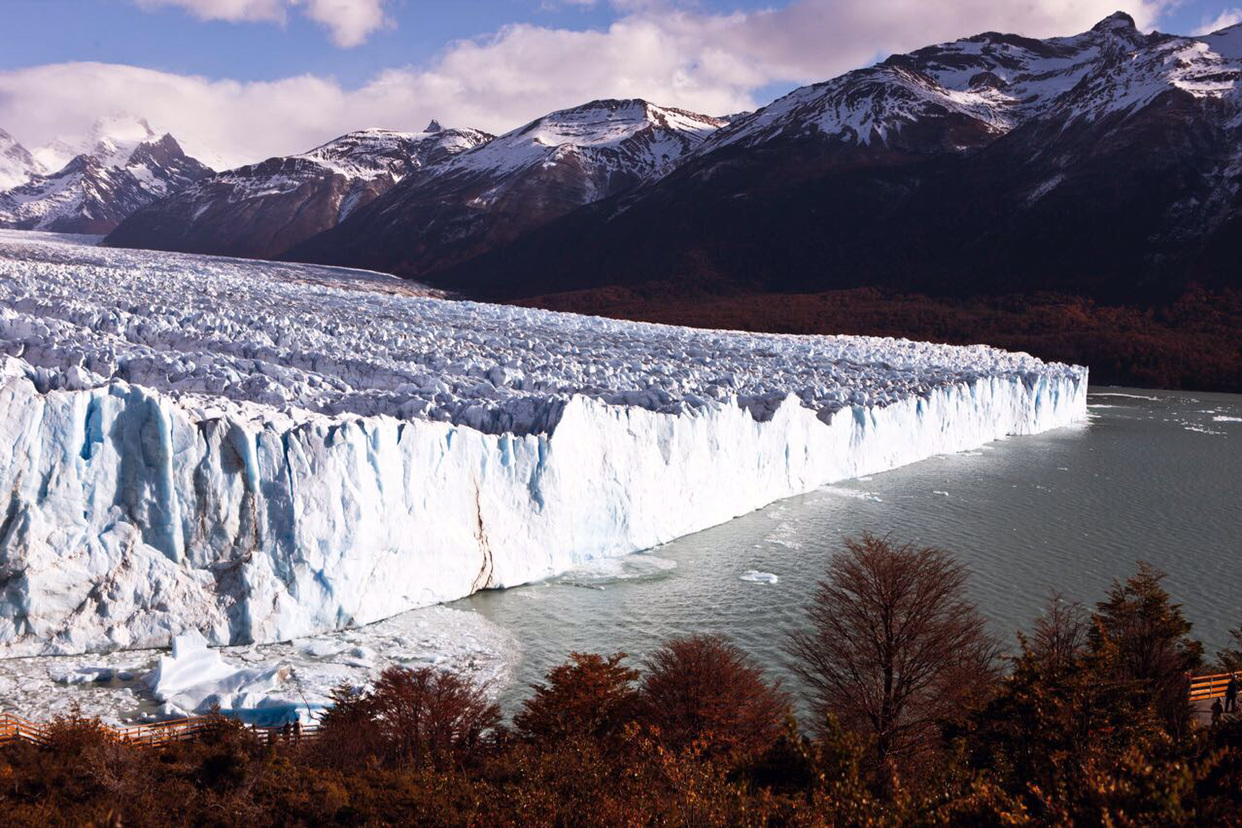 빙하 주위의 산에는 단풍이 한창이다. 남반구 4월은 북반구 10월 가을 날씨와 비슷하다.