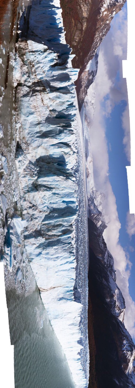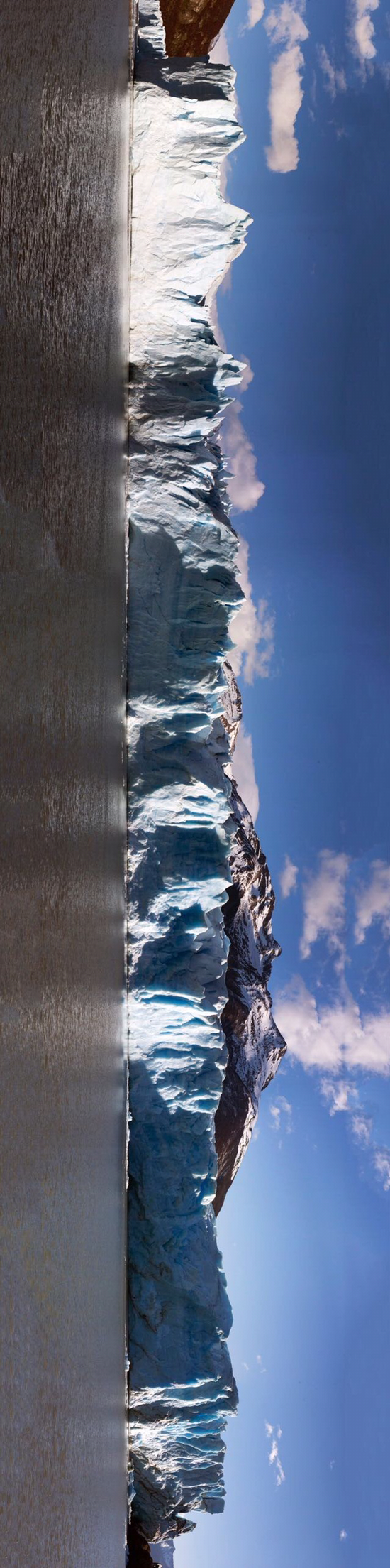 배에서 1.8 km 폭의 빙하를 한장 다 넣을 수 없어서 이를 선상에서 15장으로 세로찍기로 해서 합성한 것이다. 이 사진이 1.8km를 다 카버하는게 아니다. 왼쪽편에 보면 저쪽으로 상당한 거리가 있는 빙하가 보이는데 선상에서는 잘 안 보인다. 이를 두 장으로 나누어 보면…