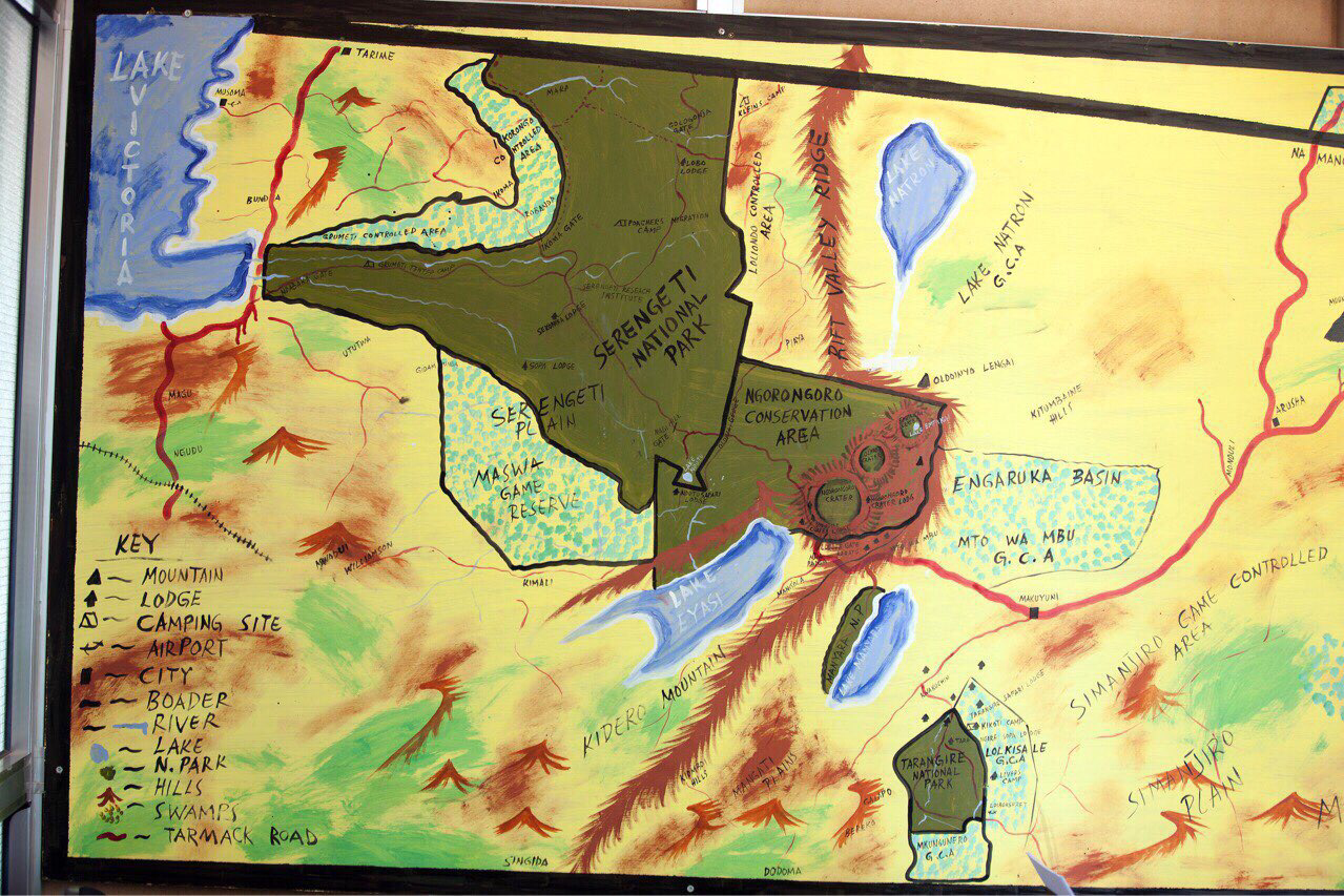 사파리투어 회사 사무실 벽에 걸려있던 지도를 찍었다. 투어는 통상 3박4일로 사파리투어의 대명사 세렝게티 국립공원과 그 옆에 붙어있는 웅고롱고로 자연보호지와 위지도 아래쪽에 있는 타랭기레(Tarangire) 국립공원 세군데를 보는데 세렝게티가 하도 방대해서 세렝게티를 2일로 잡아서 4박 5일이 된 것이다. 위 지도에서 보이는 것처럼 세렝게티 국공의 면적이 방대하고 서쪽으로는 빅토리아호수가 있고 북쪽으로 케냐국립공원과 인접하여 동물들이 계절에 따라 먹이를 찾아 이동하기가 쉽기 때문에 동물들이 세렝게티에 많이 살고 있다. 인간들이 경제활동이 편한 자기 나라의 큰 도시로 모여 살듯이 동물들도 먹이활동에 편리한 곳 세렝게티로 모여 산다고 보면 된다.
