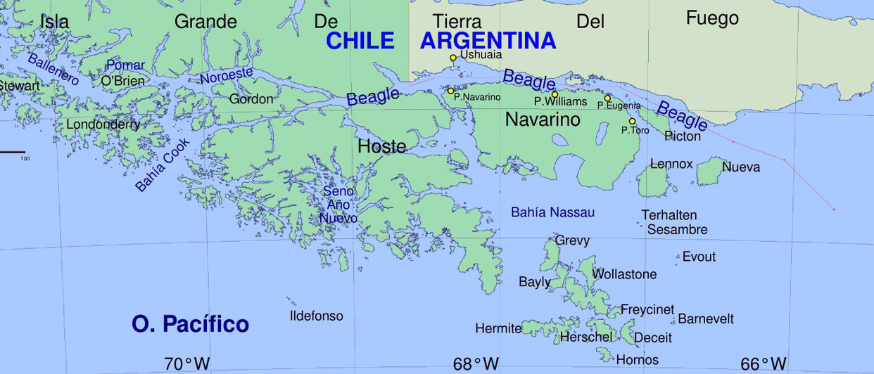 오늘 오전은 티에라델푸에고 국립공원을 투어하고 오후에는 배를 타고 우수아이아 앞바다 비글해협으로 나가 2시간 정도 몇개의 섬을 돌아보고 특별한 등대도 볼 계획이다. 위 지도와 같이 칠레와의 국경선이 희안하게 그어져 있어 국립공원도 칠레 국경과 붙어있다.