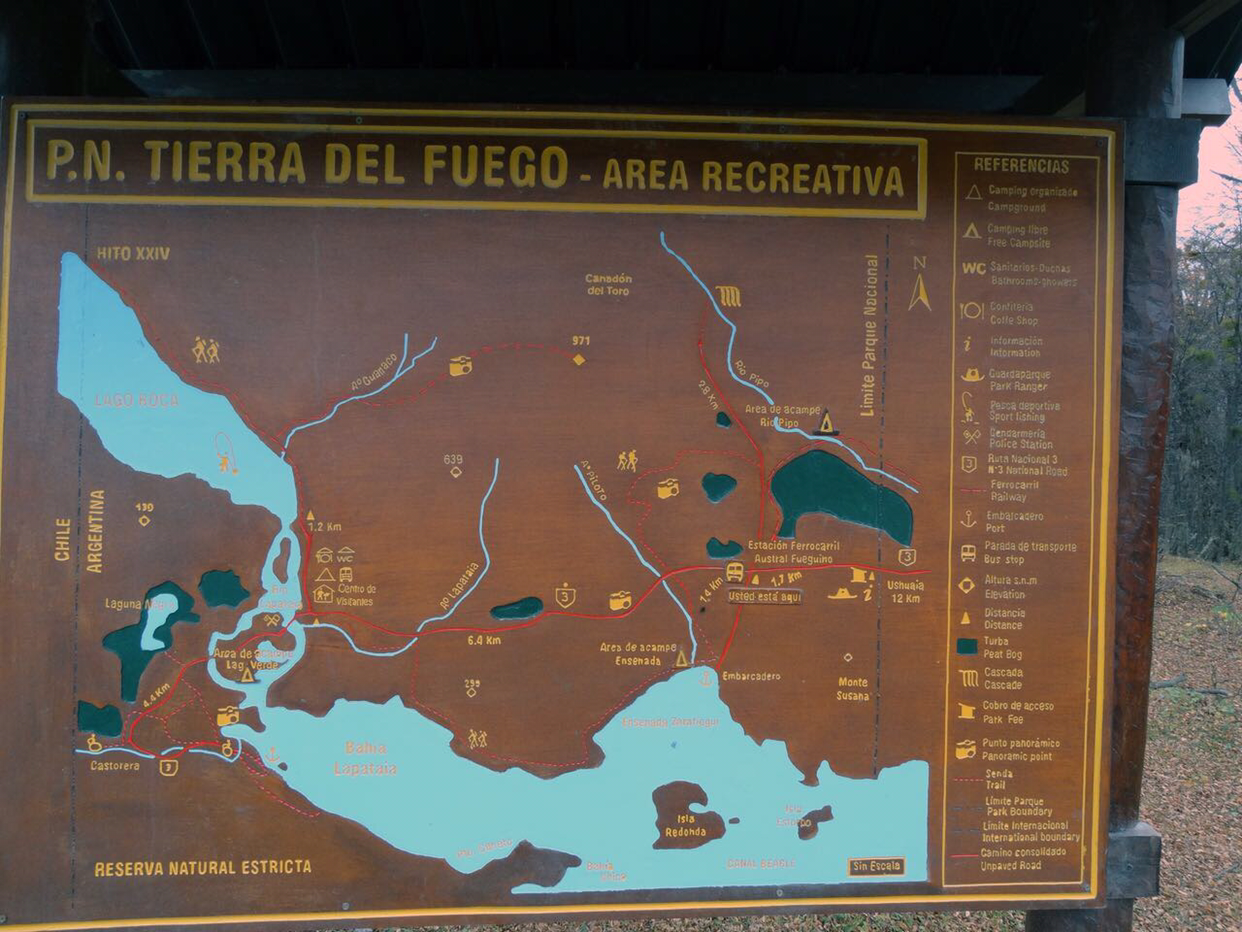 티에라델푸에고 국립공원 입구. 1960년에 지정된 국립공원으로 서쪽으로는 칠레와 닿아있고 남쪽으로는 비글해협이 펼쳐져 있다. 험준한 산, 강, 호수, 깊은 계곡이 많아 아름다운 산악 풍경을 보여준다. 힘차게 달려온 안데스 산맥이 바로 여기에서 멈추고 일부는 비글해협 밑으로 사라진다. 주변에 여러 트레킹 코스가 있다고 하니 시간을 충분히 가지고 오게되면 트레킹하면서 눈으로 즐길 수 있는 풍경이 많다.