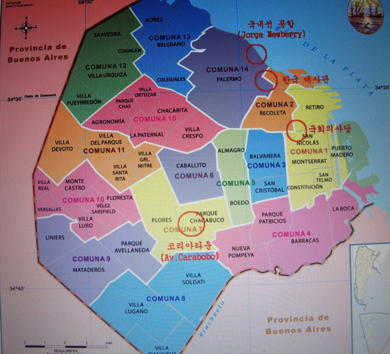 부에노스아이레스시는 총 48개 지구로 나누어지는데 이 지구라는 바리오(BARRIO)는 한국으로 치면 구보다는 작고 동보다는 큰 개념이다. 바리오를 다시 묶어서 15개 COMMUNA로 구분하는데 우리의 선거구 개념과 동일한 것 같다. 그 중 관광객들이 구경하러 다니는 바리오는 센트로 중심으로 모여있다.
