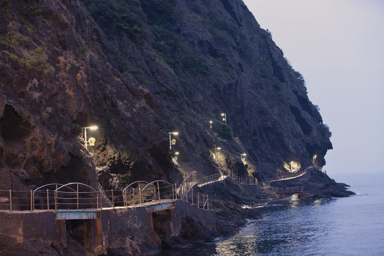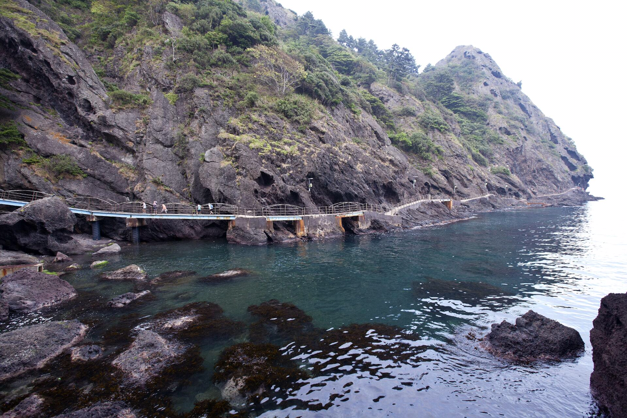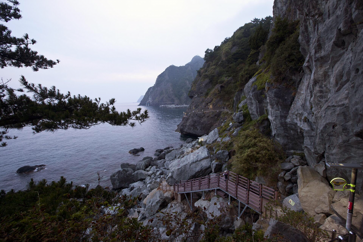 전망대를 지나 본격적으로 산책로로 내려서면 사진에서 보이는 산책로가 좁은 다리로 이어진다. 해변 돌방구 사이로 길을 내고 길을 낼 수 없는 곳에는 이렇게 다리를 놓아 연결해놓은 것이다. 중국의 험한 관광지에도 이런 형태로 길을 만들어 놓는데 이를 <잔도>라고 부르는데, 도동 산책로도 그런 <잔도>형태로 만들어 놓아 관광객들이 용이하게 다니도록 해 놓았다.